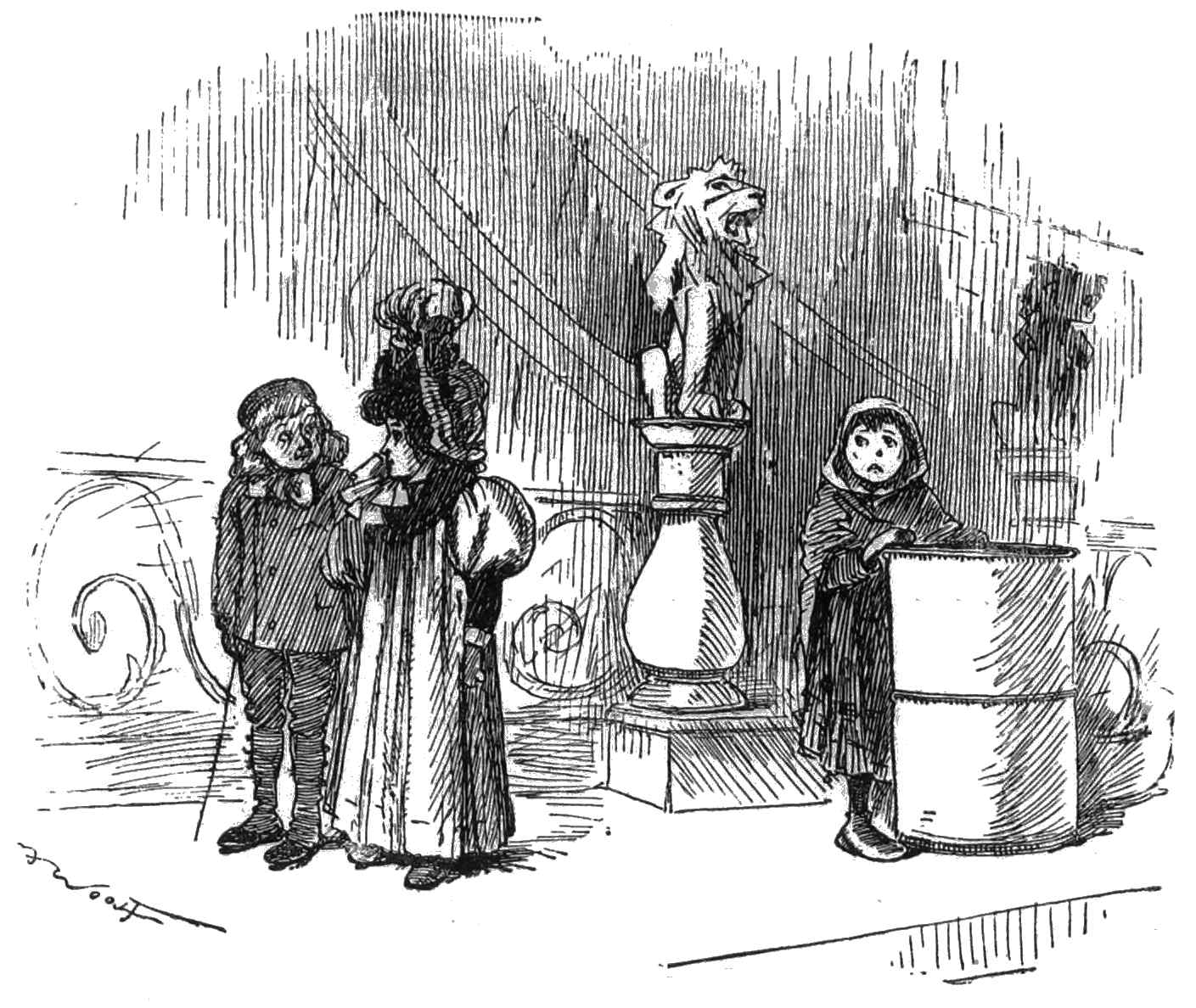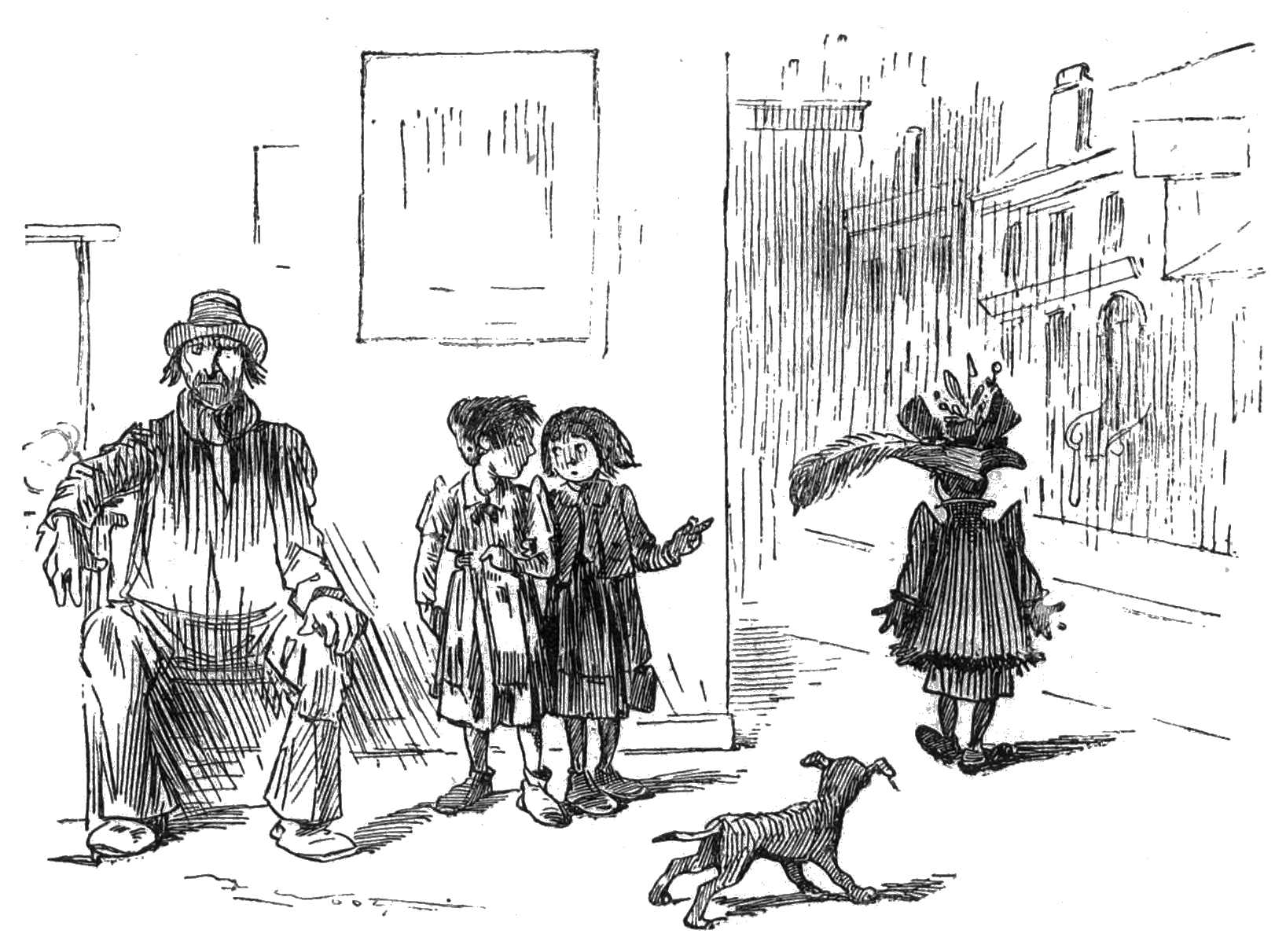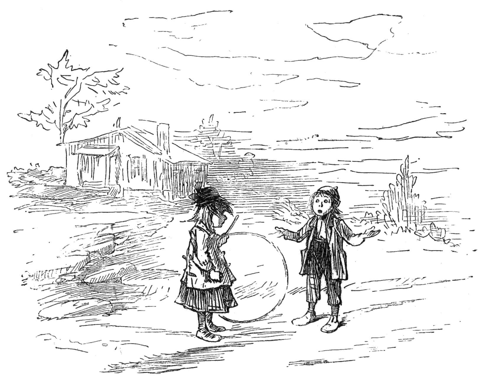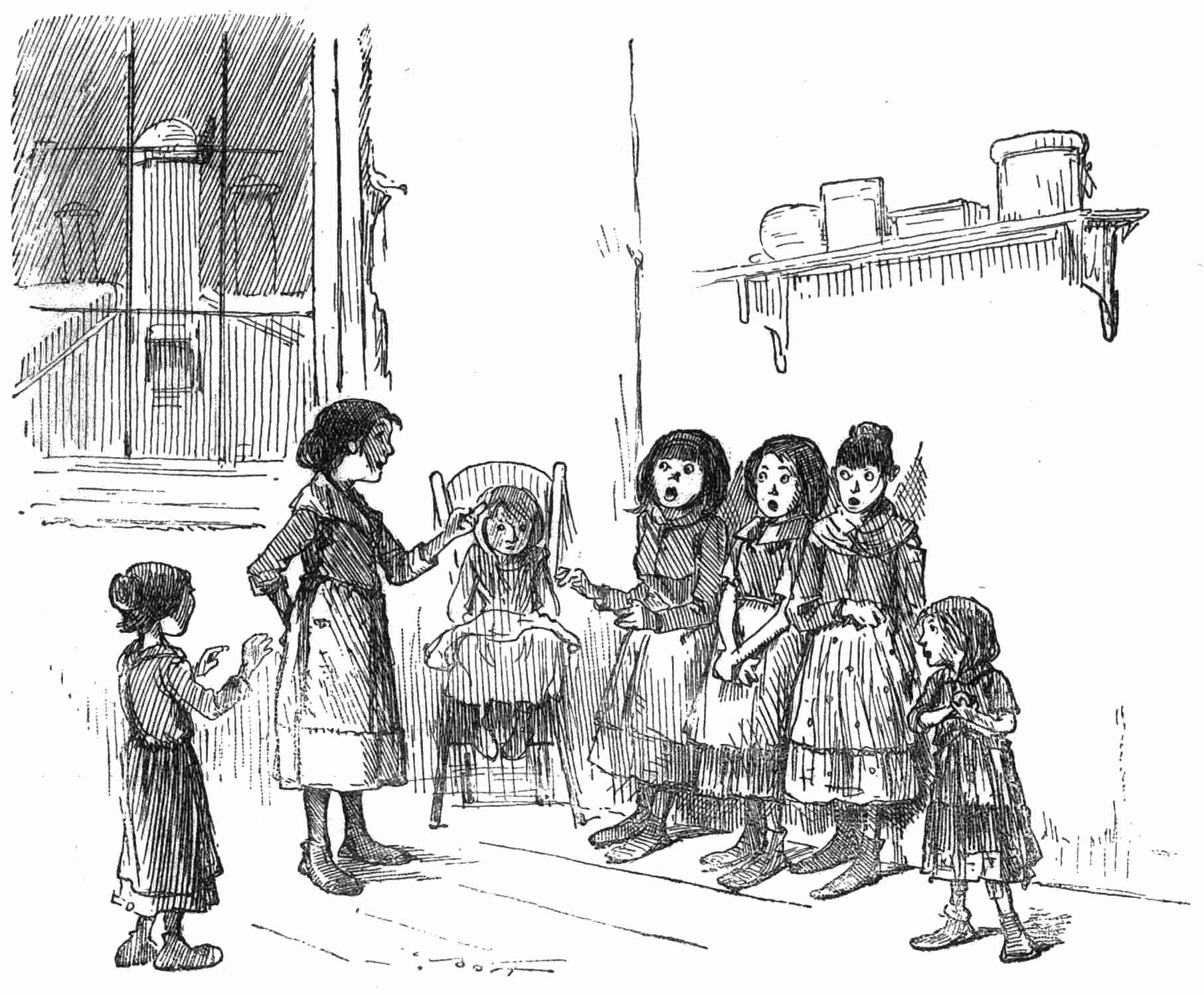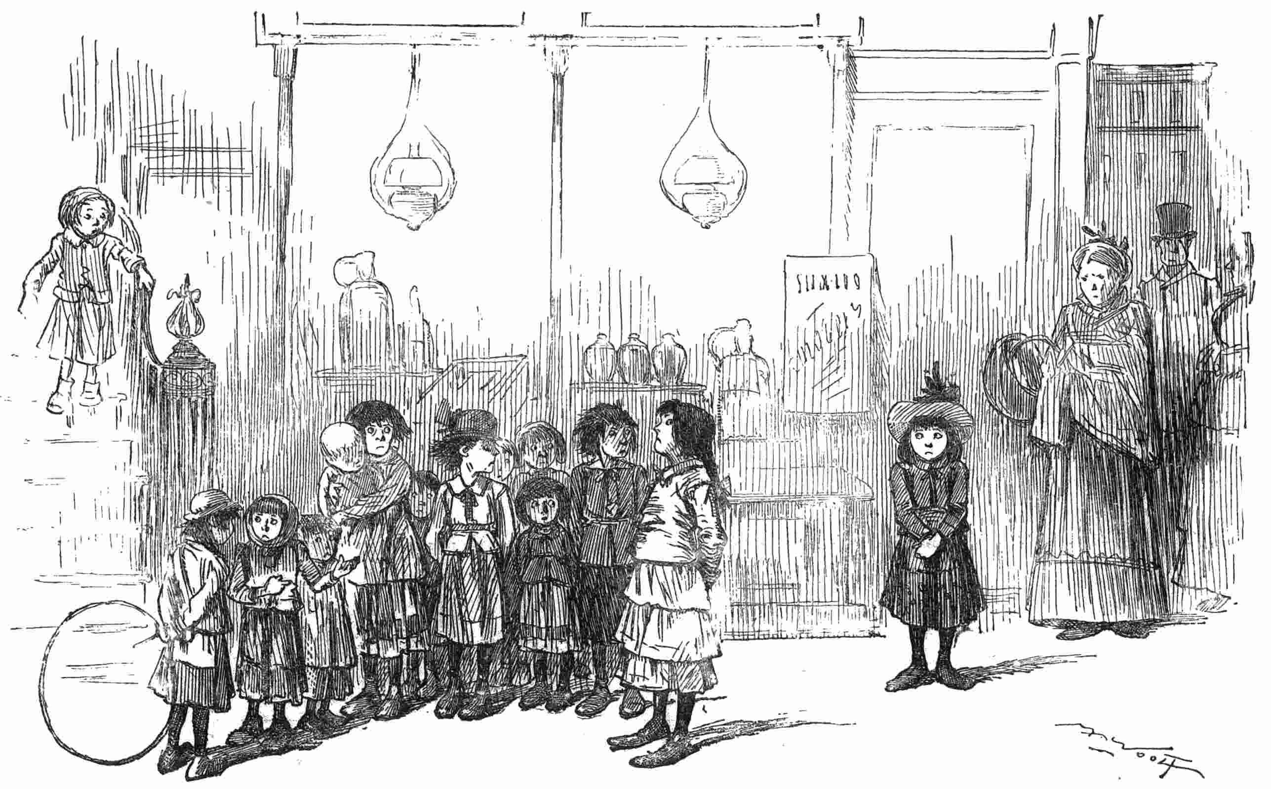Em’ly: “Yer see I wuz carried away on a yaller cloud into a big open blue place where there wuz nothin’ but dolls—blondes, bluenettes, niggers, an’ Chinese; and Santa Claus took me by the hand an’ led me up to one o’ the most beautifullest dolls I ever seen, all gold lace an’ spangles, an’ it could talk an’ sing, too. (In rapture): Oh, it wuz too loverly for anythink! An’ Santa Claus wuz just puttin’ it into my hands when I woked up!”