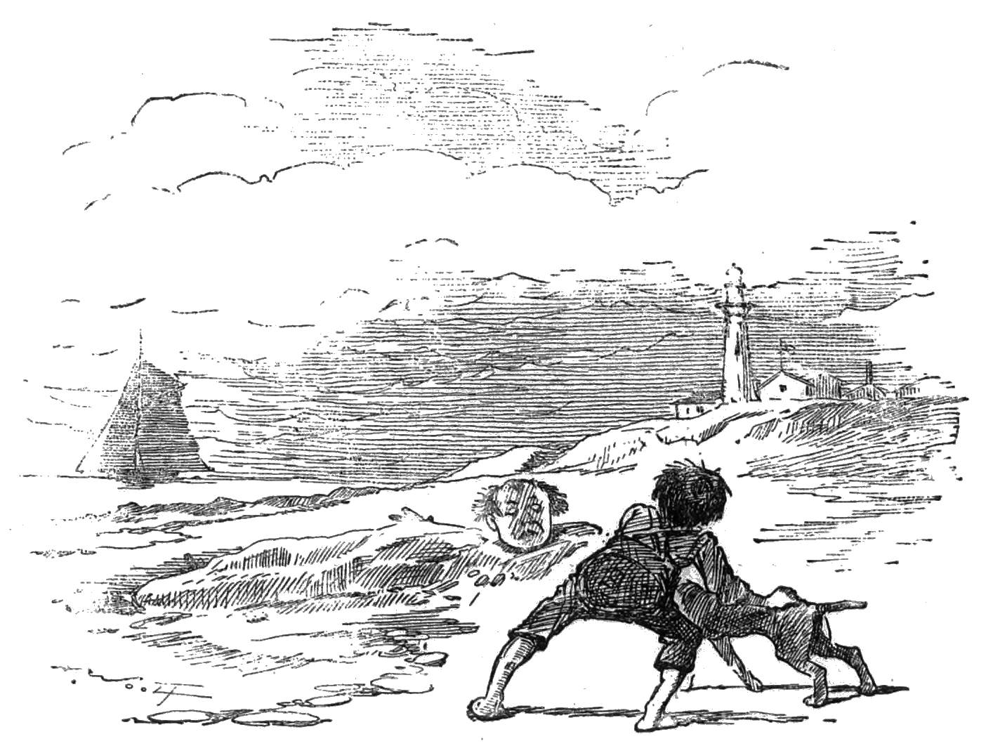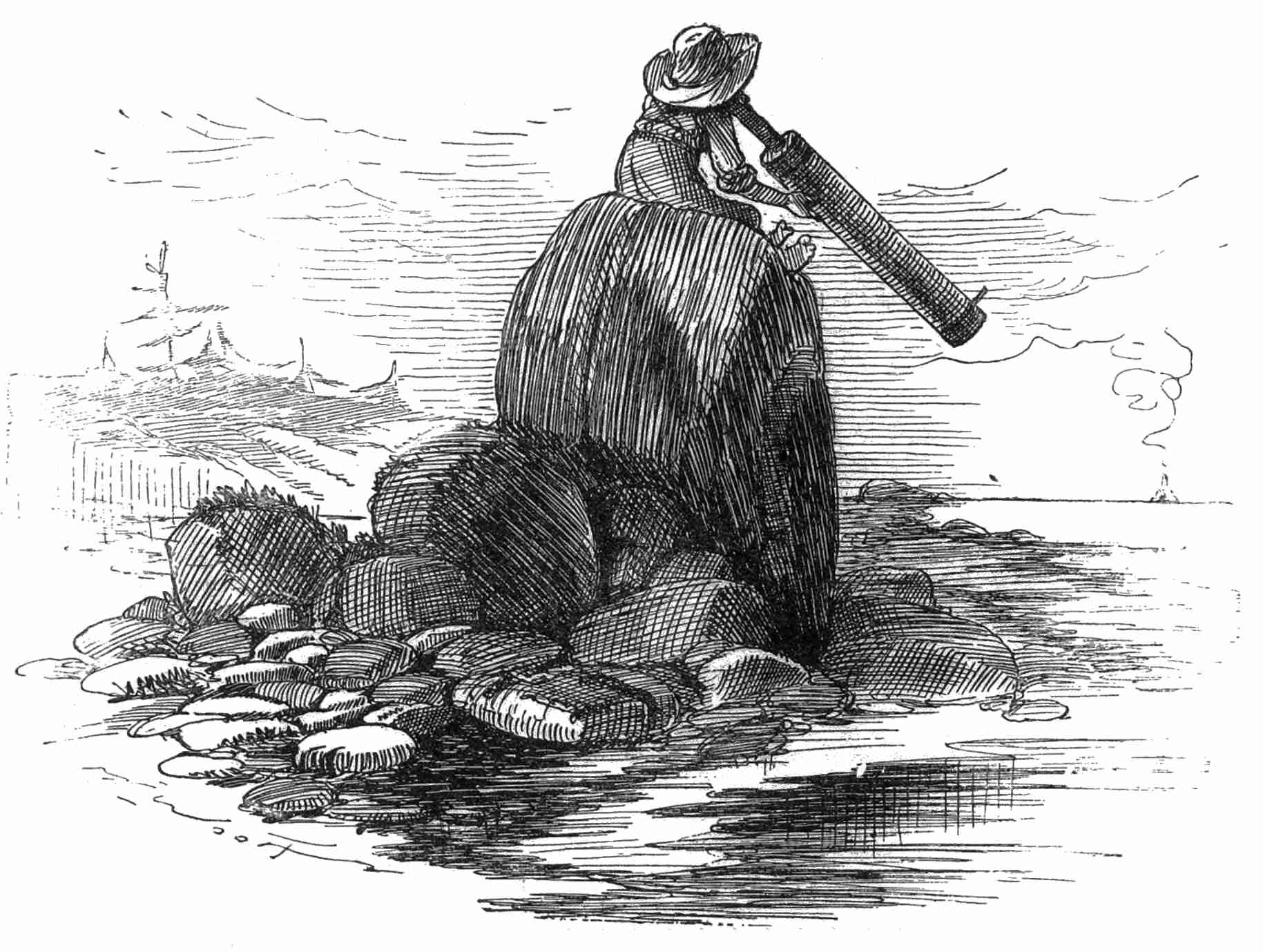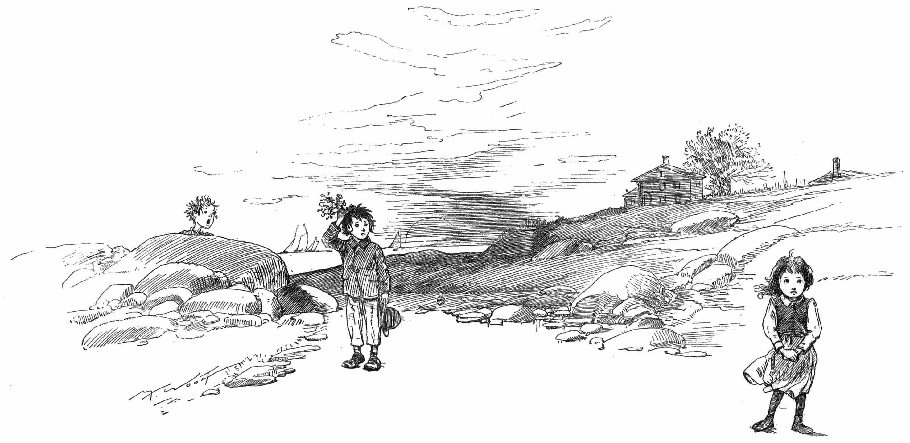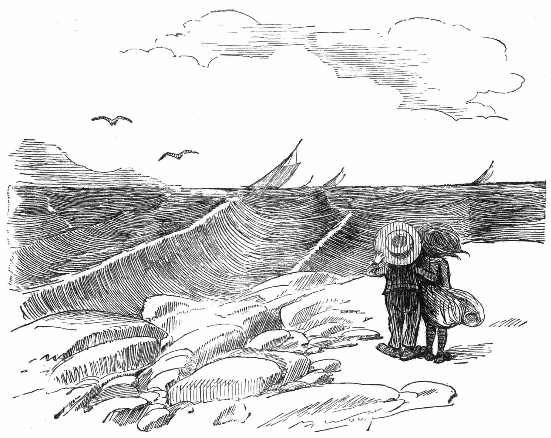 Mentor (behind rock): “Hand her de bokay, Jimmy, an’ den t’row yerself at her feet an’ tell her yer life is mizzerable, an’ dat yer’ll chuck yerself in de ocean if she don’t have yer; an’ don’t forgit de sooicide rackit. Dat fetches de wimmin every time.”
