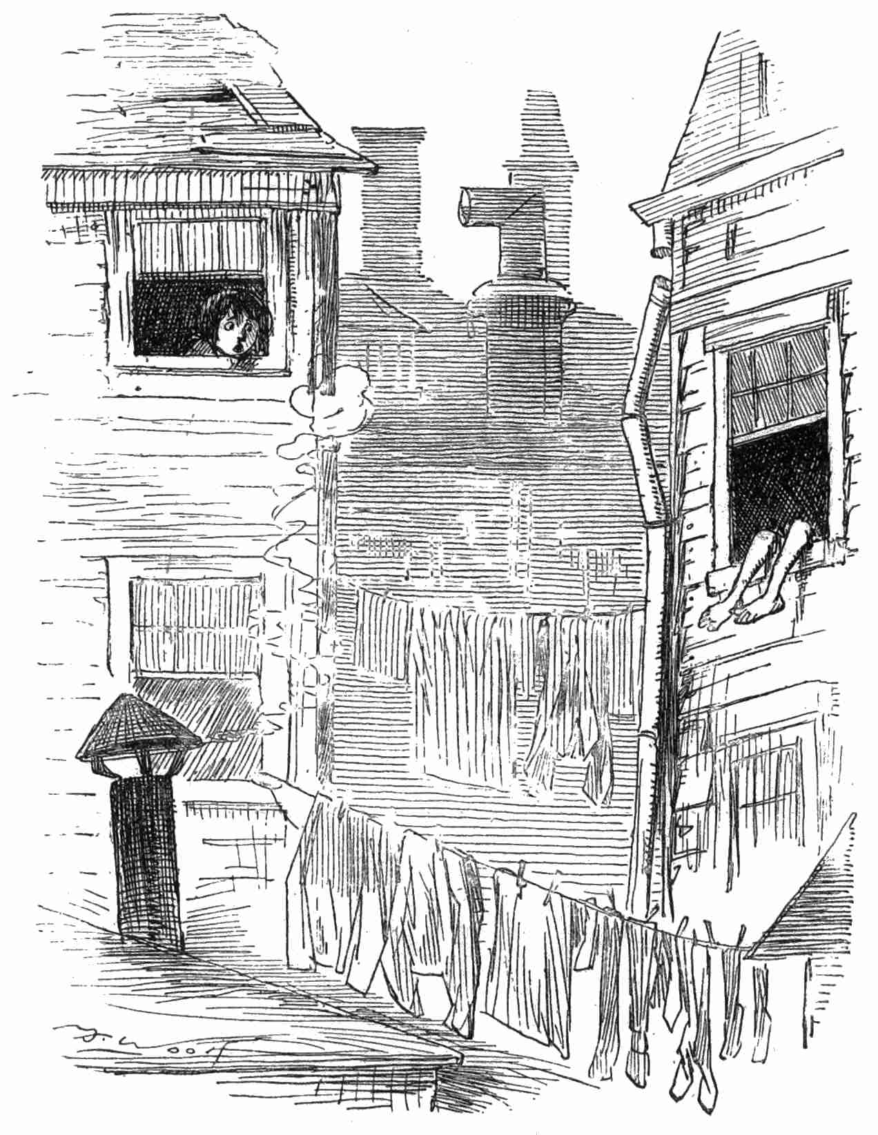 Genevieve (at upper window): “Them’s Teddy’s legs if ever Teddy lived; what could ha happened; I wonder could he have committed soo-incide ’cause I rejected him this mornin’?”
