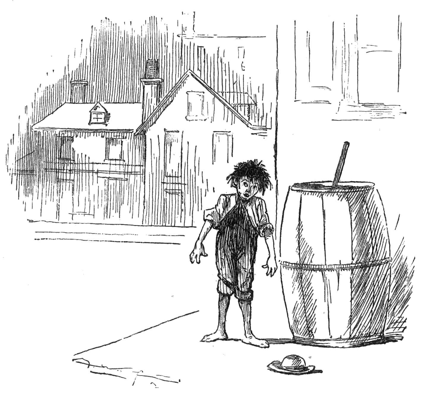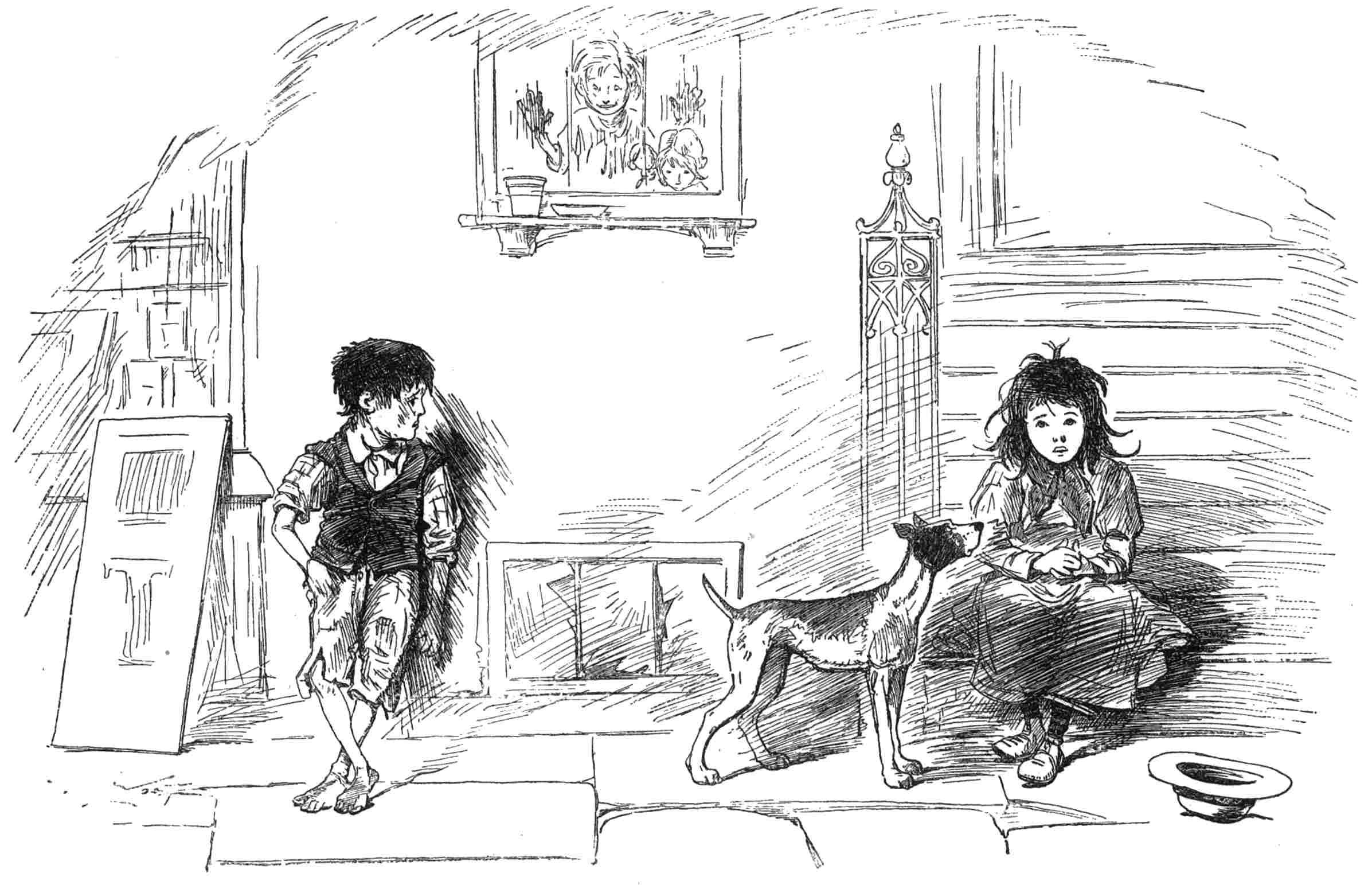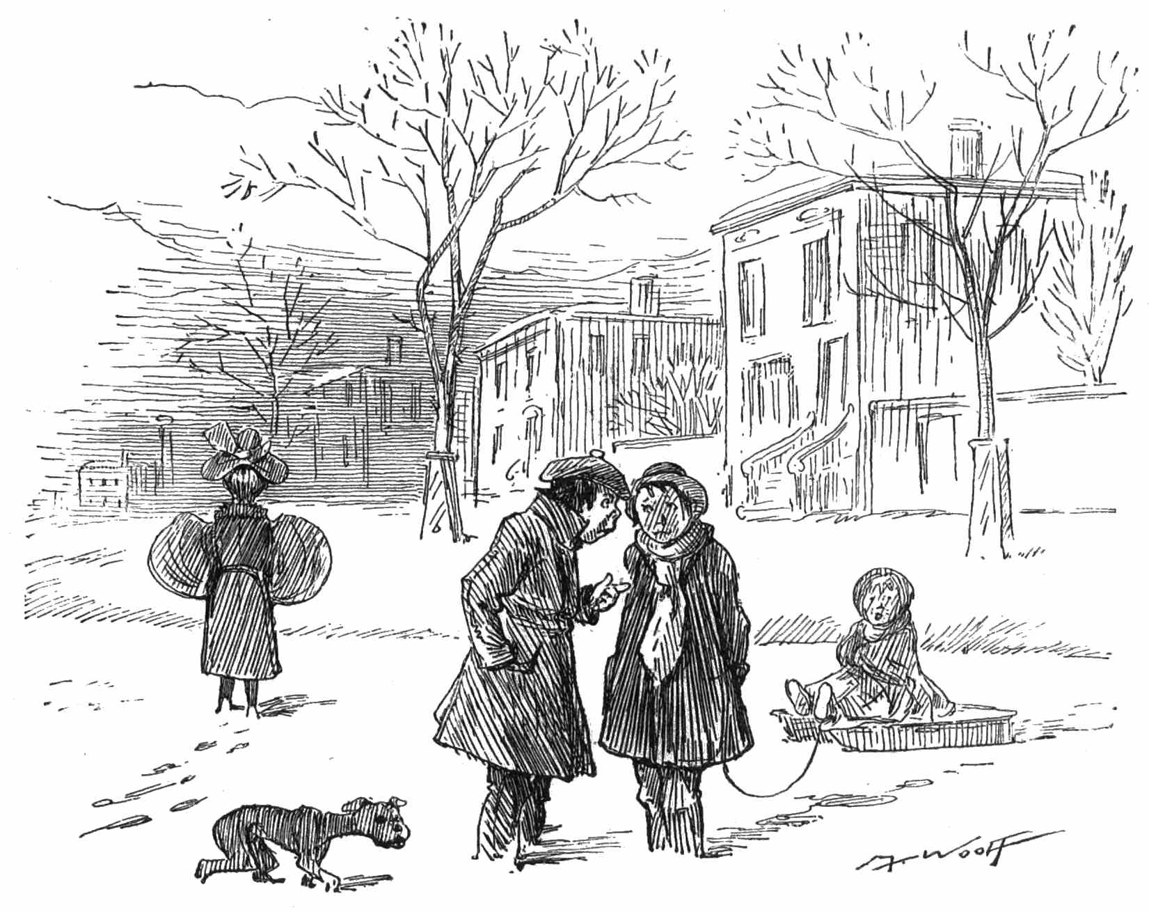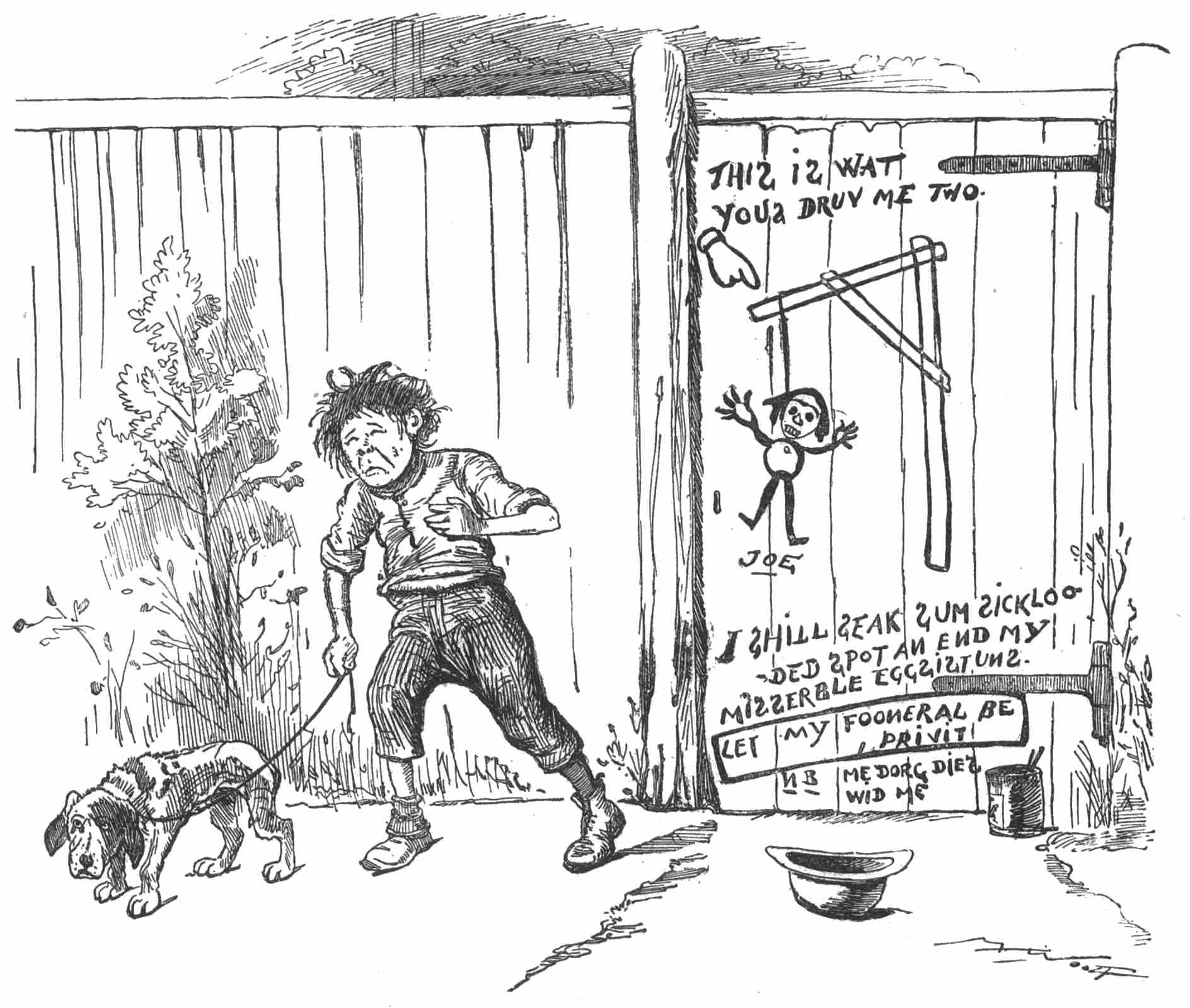 “Fellers! De gang has lost its pup! He scrapped wid a bull tarrier, an’ got it in de neck. He wuz a torrowbred, a chim dandy; a t’ree-times winner way up to de limit. He had a head on to him wot wuz almost hooman. I ain’t a-talkin’ troo me hat; I ain’t a-givin’ guff; I’m a-givin’ it to yer straight—he wuz a corker. Der Wanderbilts or Asters didn’t have de plunks ter buy dat pup—dat’s straight. He wuz way up in G—are yous wid me? His deat’ has broke me up; don’t jolly me—not on yer life. Yous wot has lungs chip in wid a song, sunthin’ sollum,—‘Ole Dog Tray,’ or ‘Sweet Maree,’—an’ den we’ll plant him. Fellers, I’se lost me grip; me name is Dennis—I’m all broke up. I’ll go chase myself an’ have a game o’ craps. S’ long!”