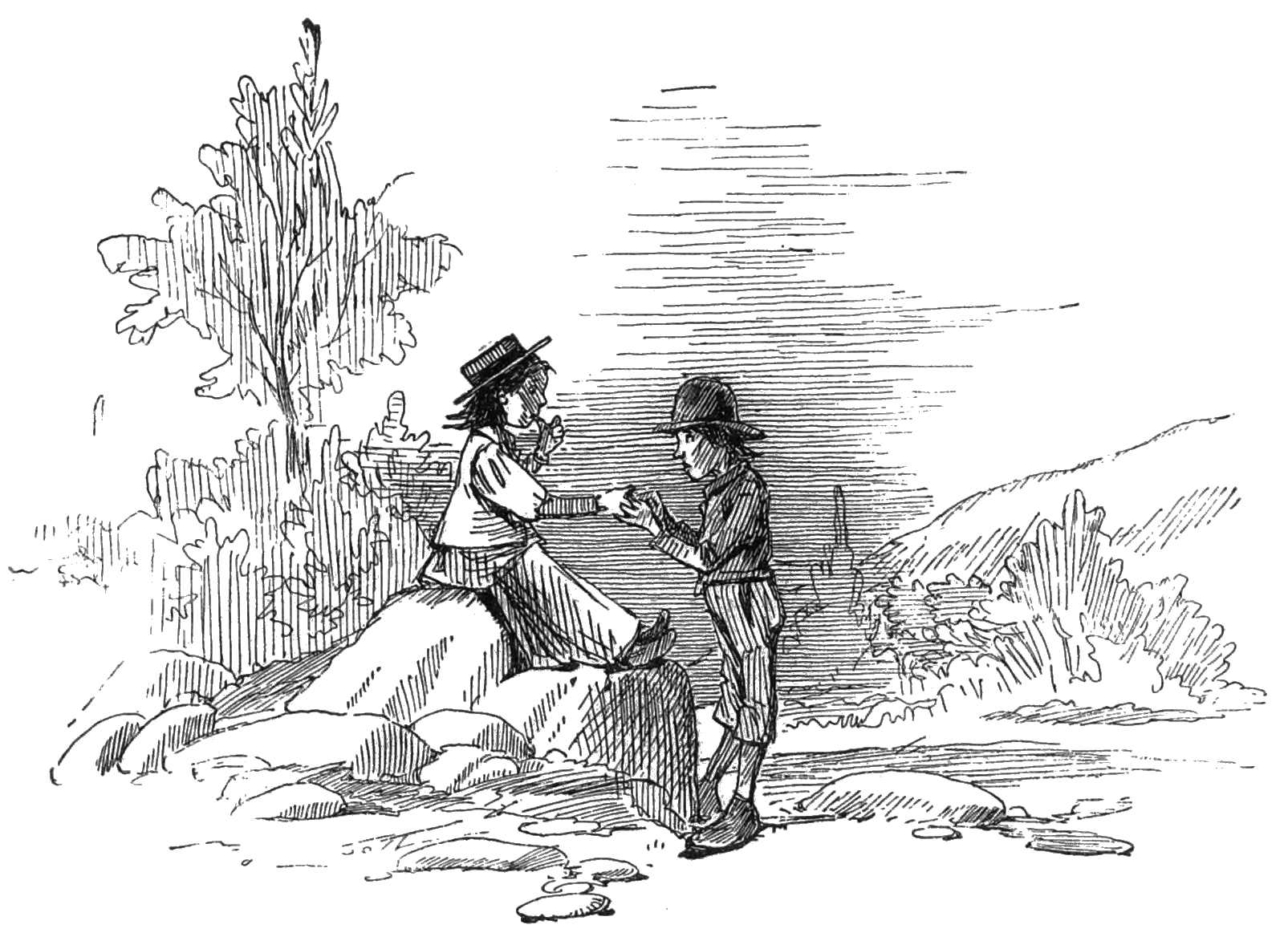 Horatio (to Lucretia): “As our engagement is not made public yet, you had better let go o’ my arm when we get a little nearer to the village!”