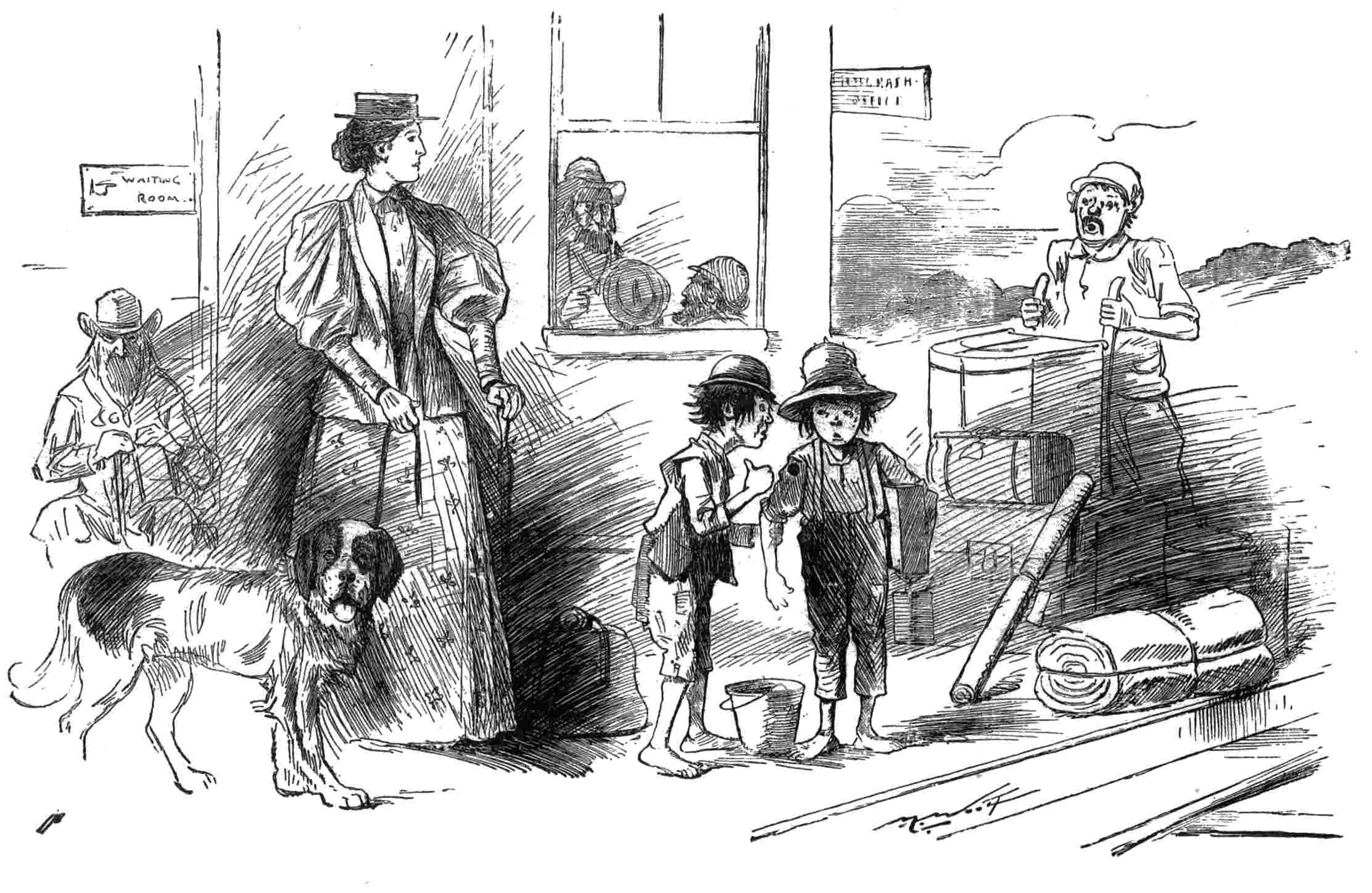 “I say, mister, how’s that fer a dog-cart, eh? Jump right in an’ I’ll take yer where yer a-goin’, an’ I won’t charge yer a cent. An’ yer’ll have the company of the lady the whole way.”
