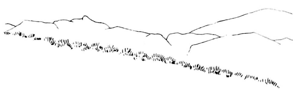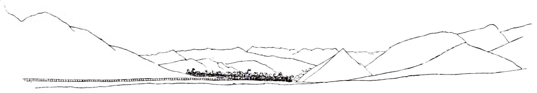 Toute la journée, il y avait des passants sur le chemin, dans les champs une foule de travailleurs. Ainsi que nous l’avons dit, la plupart des cultures consistent en blé ; cependant on rencontre aussi de l’orge et, de loin en loin, quelques champs de maïs. Deux cours d’eau importants : l’Ouad Tétouan (berges de terre presque à pic de 4 ou 5 mètres de haut ; lit de 12 mètres de large, rempli d’eau courante et assez claire, de 50 à 60 centimètres de profondeur ; fond de sable) ; et l’Ouad Meḥadjra (voici ce qu’il est dans sa partie inférieure : berges à peine marquées ; eaux vertes, de 6 à 8 mètres de large et de 30 ou 40 centimètres de profondeur, serpentant dans un lit de galets beaucoup plus large ; courant très rapide). Le Djebel Beni Ḥasan est un massif extrêmement remarquable : le versant occidental en affecte, dans sa partie nord, la forme suivante : α ; dans sa région sud, celle-ci : β ; les plus hauts sommets, dont les cartes marines nous donnent les altitudes, 1410 mètres, 2210 mètres, 1818 mètres, en sont invisibles du fond de la vallée ; une haute muraille de pierre grise, à crête dentelée, le couronne de ce côté et lui donne l’aspect le plus étrange : on dirait une série de rochers de Gibraltar juxtaposés sur un piédestal de montagnes : quelque chose comme ceci : γ. La crête supérieure de cette muraille me paraît être à une altitude à peu près uniforme pouvant varier entre 1200 et 1500 mètres. Au-dessus, quelques cultures entrevues en deux ou trois points semblent révéler l’existence d’un plateau.