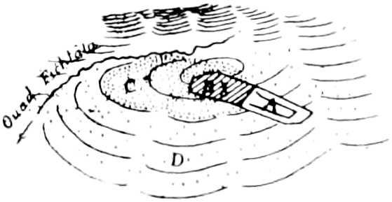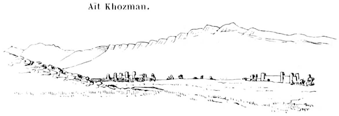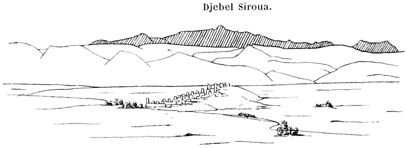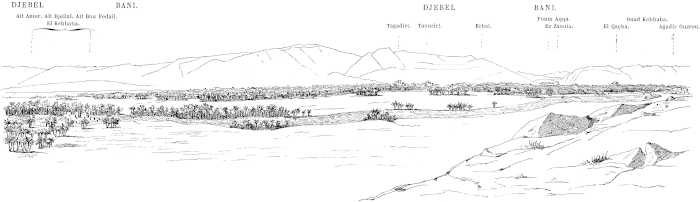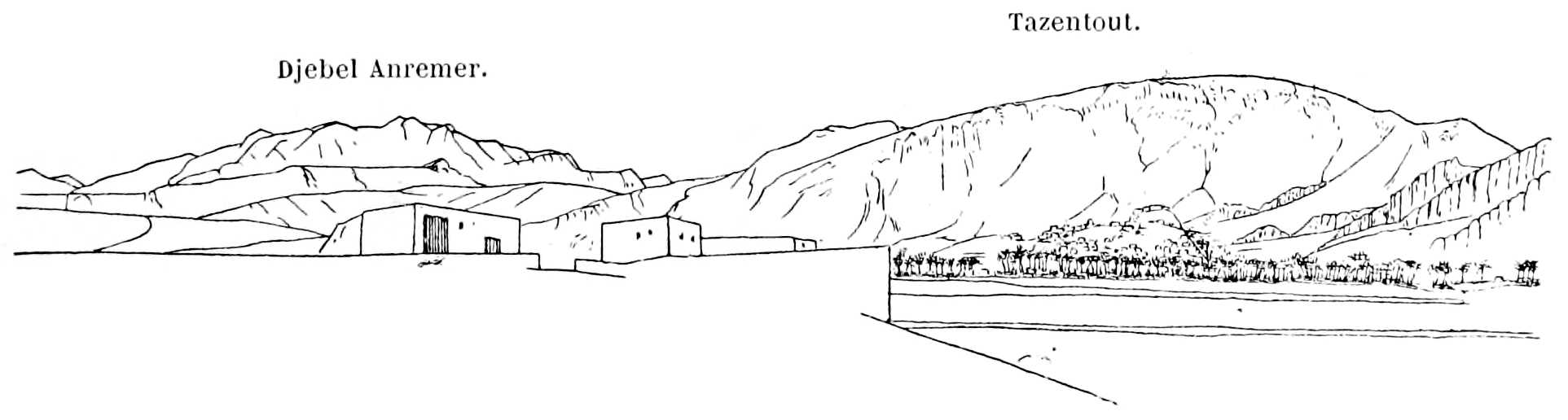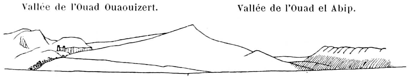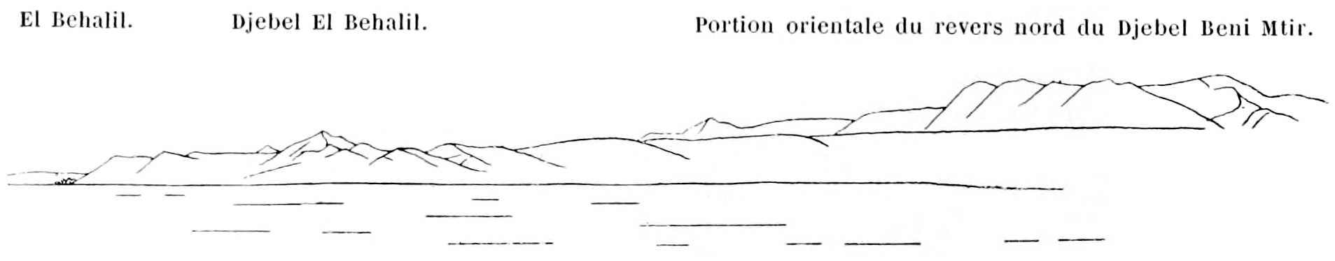 Pendant cette dernière partie de ma route, j’ai encore rencontré beaucoup de personnes sur le chemin. Celui-ci ne cesse pas d’être bon : une seule côte un peu raide, aucun passage difficile. Sol terreux, peu de pierres. J’ai traversé deux cours d’eau assez importants : l’Ouad Arezaz (berges de terre d’un mètre ; eau claire et courante de 60 centimètres de profondeur ; 8 mètres de large ; lit de galets), et l’Ouad el Ḥechaïch (il coule à pleins bords dans un lit de gravier de 10 mètres de large ; eau claire et courante de 60 centimètres de profondeur). Le Djebel Mezedjel, identique au Djebel Beni Ḥasan, n’est que la continuation de celui-ci sous un autre nom : on le voit se prolonger bien loin encore dans le sud, appelé alors Djebel el Akhmâs.