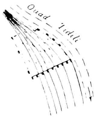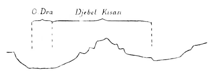 Au mois de décembre 1883, le vicomte de Foucauld touchait le Dhera’a, au sud de Tatta. Quelque temps après, il le revoyait, loin dans le nord-est de ce point, dans le district de Mezguîta, et là, sous le Djebel Sagherou, c’est un beau et large fleuve permanent, coulant avec une rapidité moyenne au milieu de plantations de dattiers ; je ne résiste pas au plaisir de vous faire part d’une découverte que M. de Foucauld m’a fait faire. Son itinéraire reporte d’un degré plein, vers l’ouest, le tracé de cette partie du cours du fleuve telle qu’elle est indiquée sur la carte du docteur Rohlfs, et, bien que les deux voyageurs n’aient pas touché le même point de l’Ouâdi Dhera’a, la correction si importante que je signale pourra sans doute être utilisée pour redresser l’itinéraire même du docteur allemand.