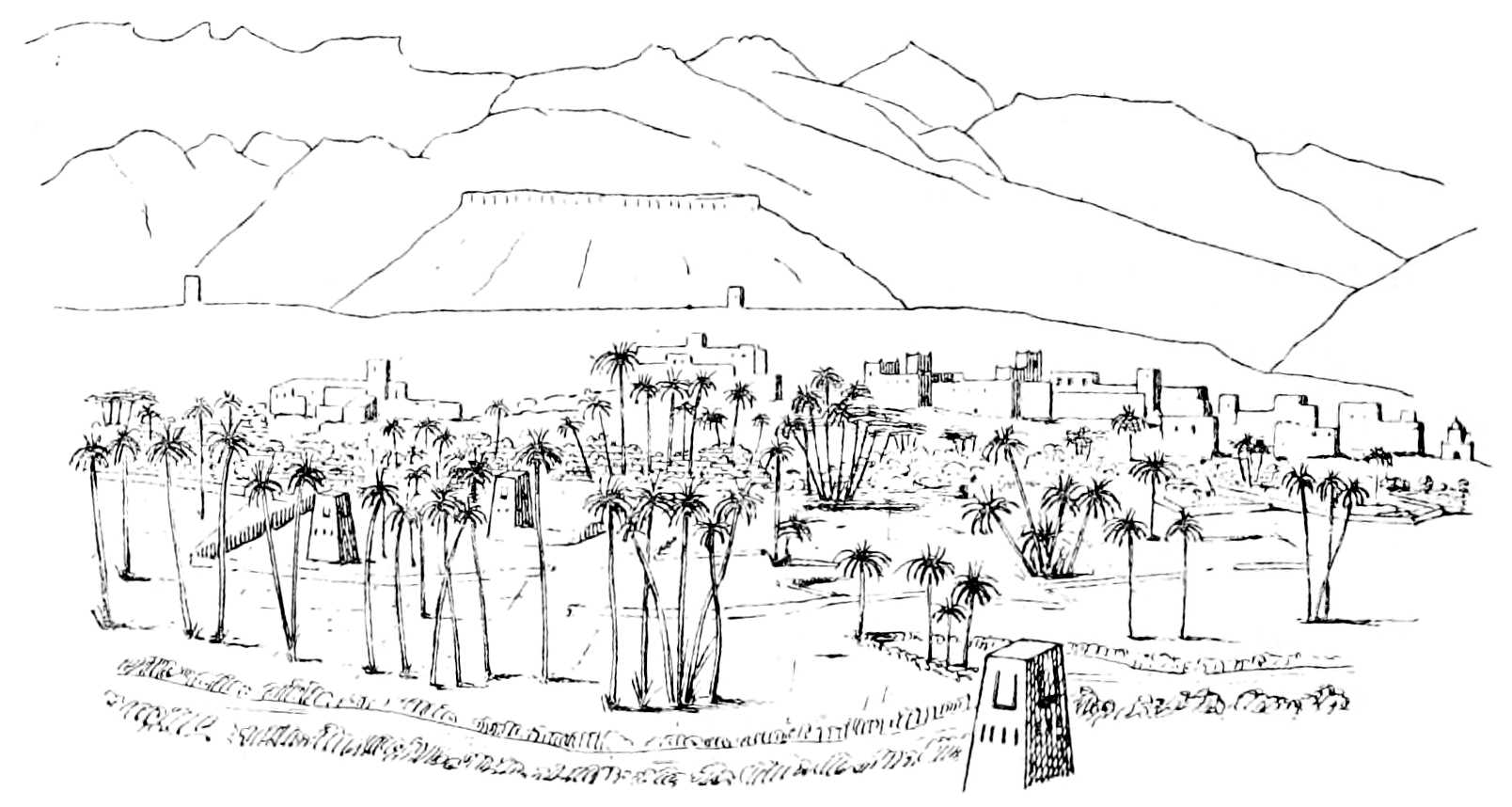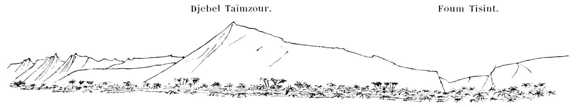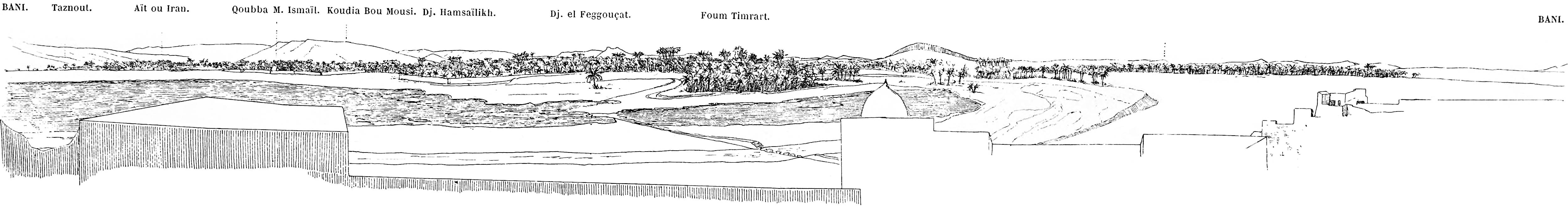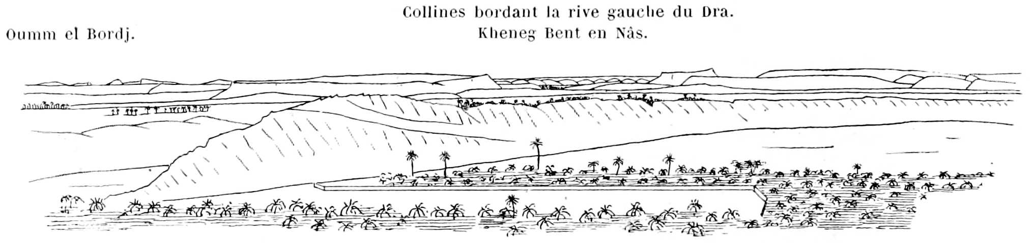Toujours en terrain neuf, M. de Foucauld continue sa route sur Todegha, Ferkela et Gherîs, trois oasis qui, dans son langage imagé, « s’allongent comme trois tronçons de serpent » dans les lits de cours d’eau affluents du Zîz. Il entre donc là dans le bassin hydrographique à l’extrémité sud duquel s’épanouit le Tafîlelt, le berceau de la dynastie marocaine régnante, le lieu d’exil pour ceux de la famille impériale qui pourraient devenir des prétendants, le groupe d’oasis célèbre, dans une vaste partie de l’Afrique, pour les cuirs qu’on y prépare avec une grande perfection.