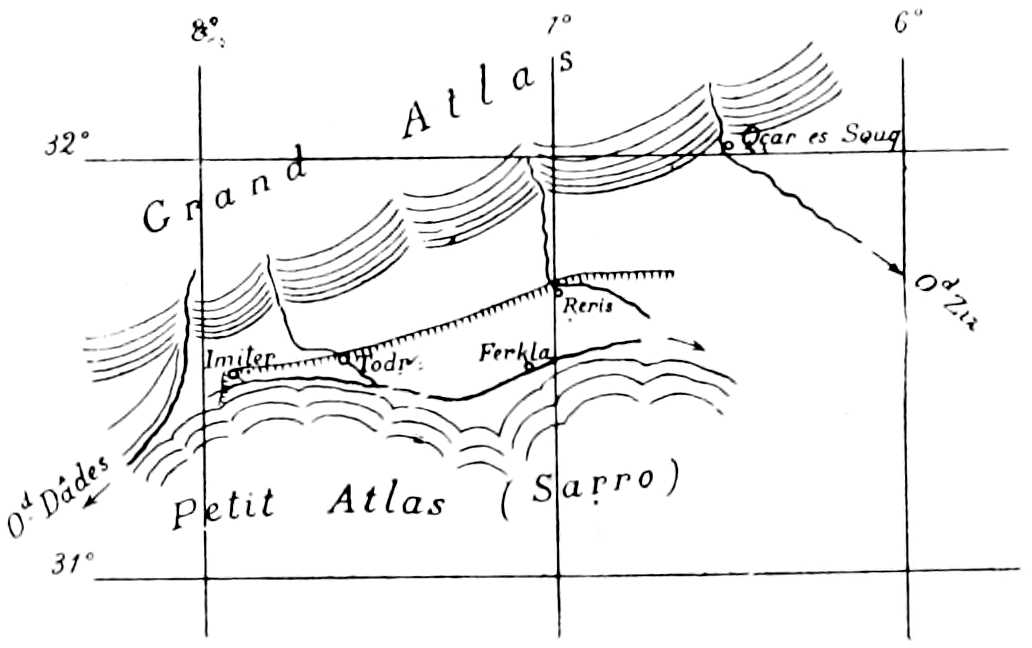 Mais à 50 kilomètres dans le nord, à 150 et à 200 kilomètres dans le sud, cette arête maîtresse est flanquée de chaînes parallèles dont le tracé sur la carte de M. de Foucauld est toute une révélation. Malgré le soin apporté par les géographes les plus habiles, aucun d’eux jusqu’ici n’avait trouvé dans les observations et les renseignements des voyageurs assez de données pour débrouiller ce qui était resté souvent un chaos, un enchevêtrement presque fantastique de sierras anastomosées. M. de Foucauld rectifie et simplifie tout cela d’après ce qu’il a vu et observé, et les géographes ne seront peut-être pas seuls à s’en réjouir, les géologues, eux aussi, en éprouveront de la satisfaction. Au nord de l’Atlas, court, nous le savons maintenant, une chaîne de 300 kilomètres, qui prend les noms de Djebel Aït Seri et de Djebel Benî Ouaghaïn ; au sud, c’est d’abord le petit Atlas, l’Anti-Atlas de la carte de Lenz, avec son prolongement oriental, le Djebel Sagherou, et enfin, encore plus au sud, le Djebel Bani, dont le rabbin Mardochée nous avait appris le nom, et que Lenz a coupé sans s’inquiéter de ce nom.