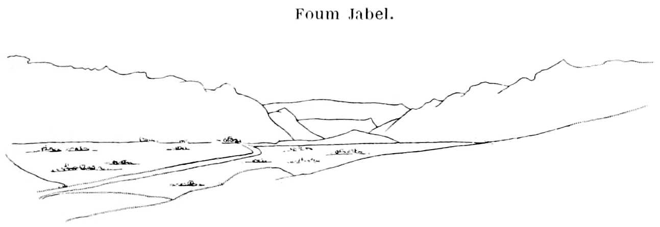 Durant toute la route le chemin est aisé. On est continuellement en montagne : par conséquent beaucoup de montées, beaucoup de descentes, un terrain généralement pierreux ; mais de passage difficile, point. Au début, dans la basse vallée de l’Ouad Meḥadjra, le pays a un aspect sauvage : la rivière est encaissée entre deux hauts[6] talus tout couverts de broussailles ; myrte, bruyère, palmiers nains, et surtout lentisques : au delà de ces talus on ne voit, à l’ouest, que de longues croupes boisées se succédant les unes aux autres ; à l’est, que la haute muraille rocheuse qui couronne le Djebel Beni Ḥasan. Cette dernière se dresse toute droite au-dessus de nos têtes : à peine se trouve-t-il entre elle et les lentisques une étroite bande de cultures : quant à l’ouad, c’est un torrent aux eaux vertes et impétueuses. Mais après quelque temps le paysage se modifie : la bande de cultures s’élargit ; des troupeaux paissent dans les broussailles ; on rencontre des villages. On marche encore : la rivière prend un autre nom : un palmier solitaire croissant sur sa rive la fait appeler Ouad en Nekhla. A ce moment s’opère un changement complet : lentisques et palmiers nains disparaissent : les talus s’arrondissant deviennent des côtes assez douces, que garnissent des cultures. Le Djebel Beni Ḥasan présente maintenant un aspect enchanteur : des champs de blé s’étagent en amphithéâtre sur son flanc et, depuis les roches qui le couronnent jusqu’au fond de la vallée, le couvrent d’un tapis d’or : au milieu des blés, brillent une multitude de villages entourés de jardins : ce n’est que vie, richesse, fraîcheur.