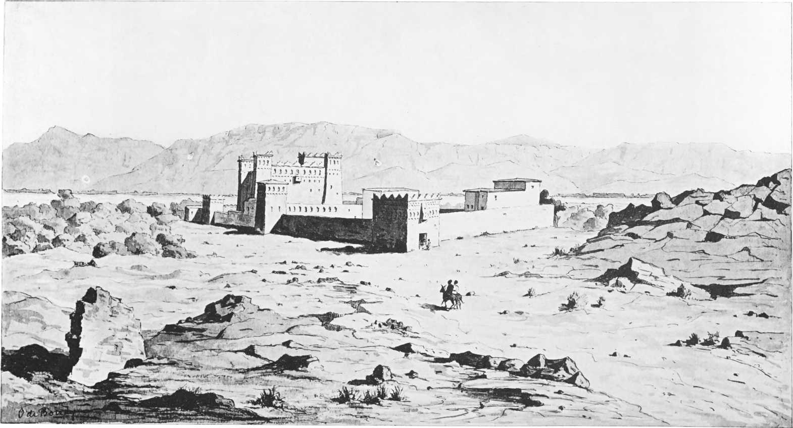 Ces sires de Tikirt, de Tazenakht, et cætera, ont des résidences fortifiées, aux murs flanqués de quinze[XI] à vingt tours. Leurs vassaux aussi sont loin d’inspirer la pitié, car ils vivent dans des maisons à un ou deux étages, construites en pisé épais et solide, et dont les murailles extérieures sont ornées de moulures.