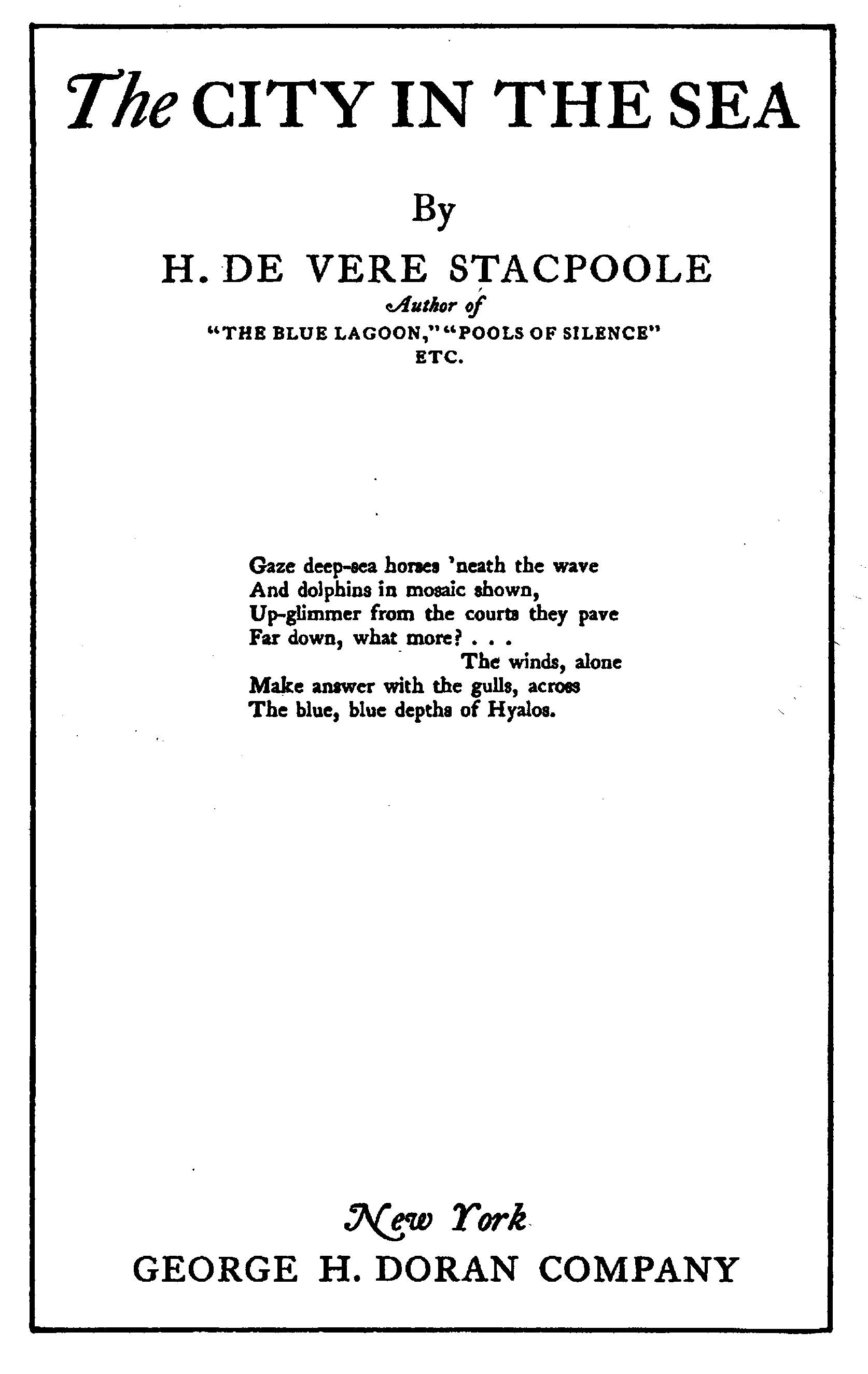 In June of last year, 1925, long after this book was finished, the Morning Post published an account of how an Arab fisherman off the Isle of Jerba had discovered a city under the sea, giving intimate details that might have been taken from my little town Hyalos—details vouched for by Count de Prohak and Sir Dennison Ross.