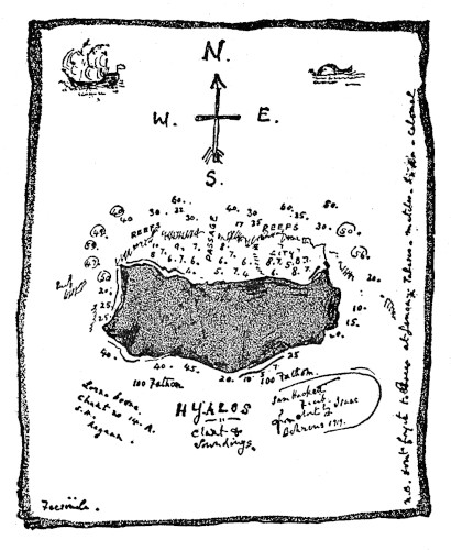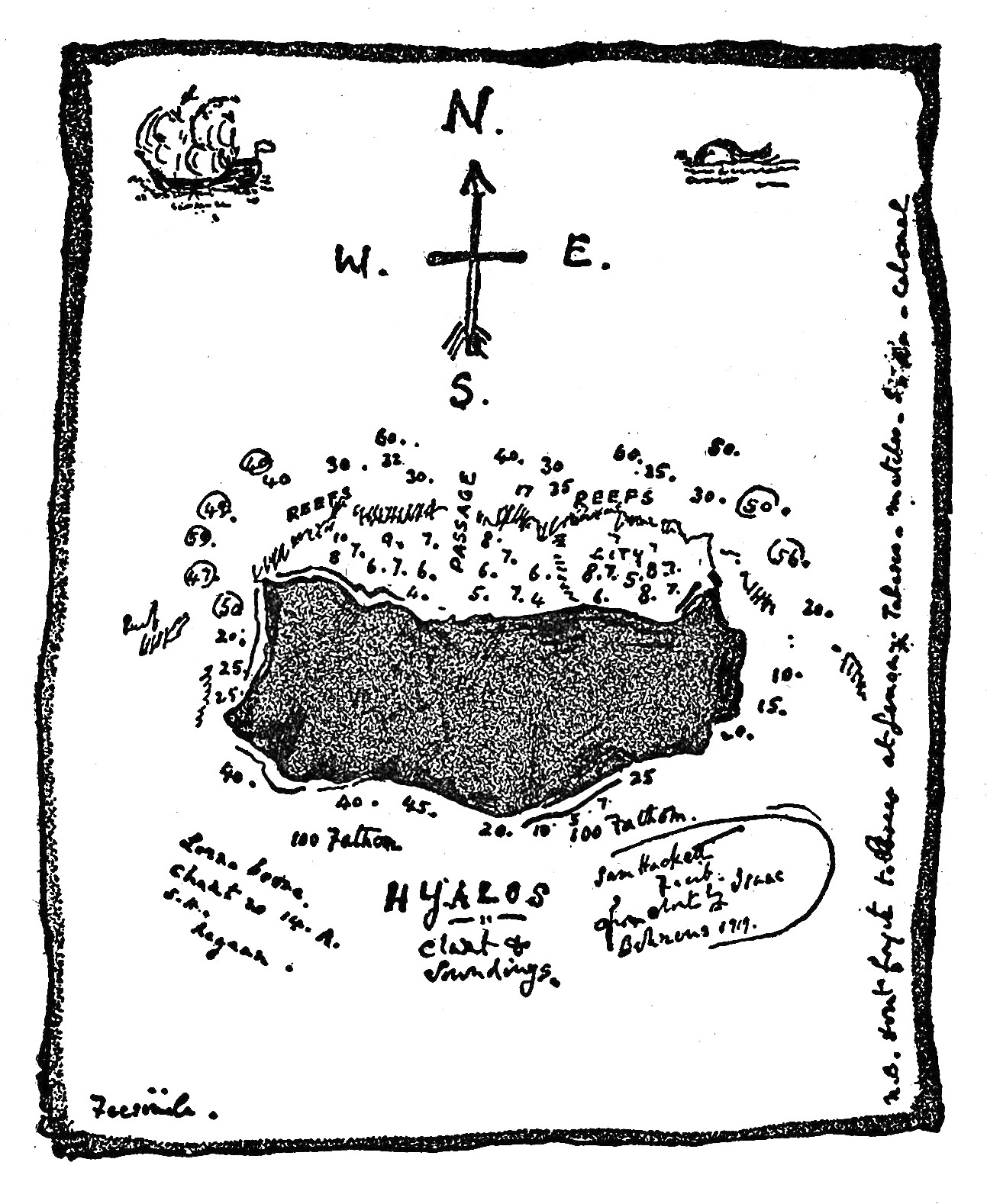 The Island of Hyalos from a sketch map made on board the Lorna Doone, giving soundings within and without the reefs.