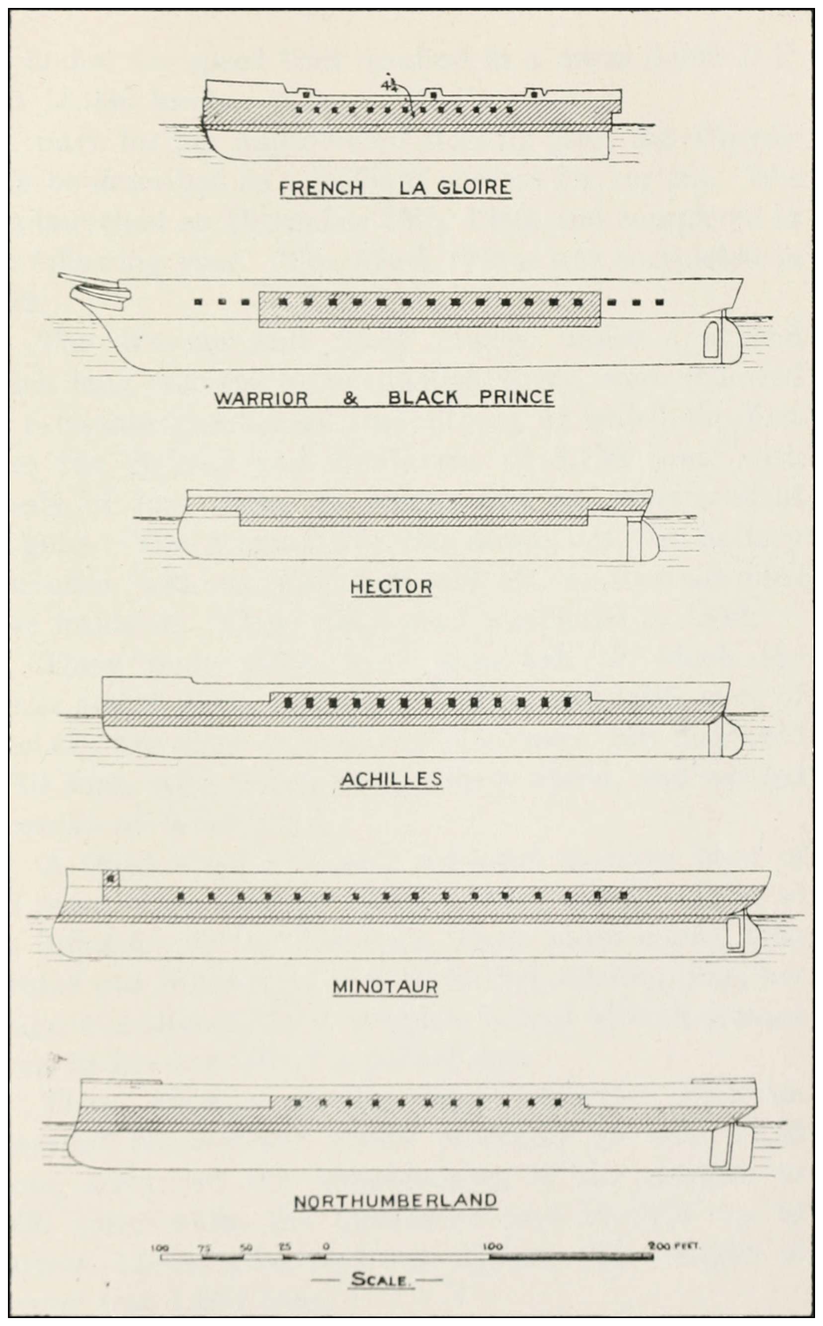 94 In 1863, three ironclads, the Lord Clyde and Lord Warden, of 7,840 tons, and a small ship, the Pallas, 3,660 tons, were constructed with wooden hulls, in order to use up the stores of timber which had been accumulated.—See p. 70, Our Ironclad Ships, by Sir E. J. Reed.