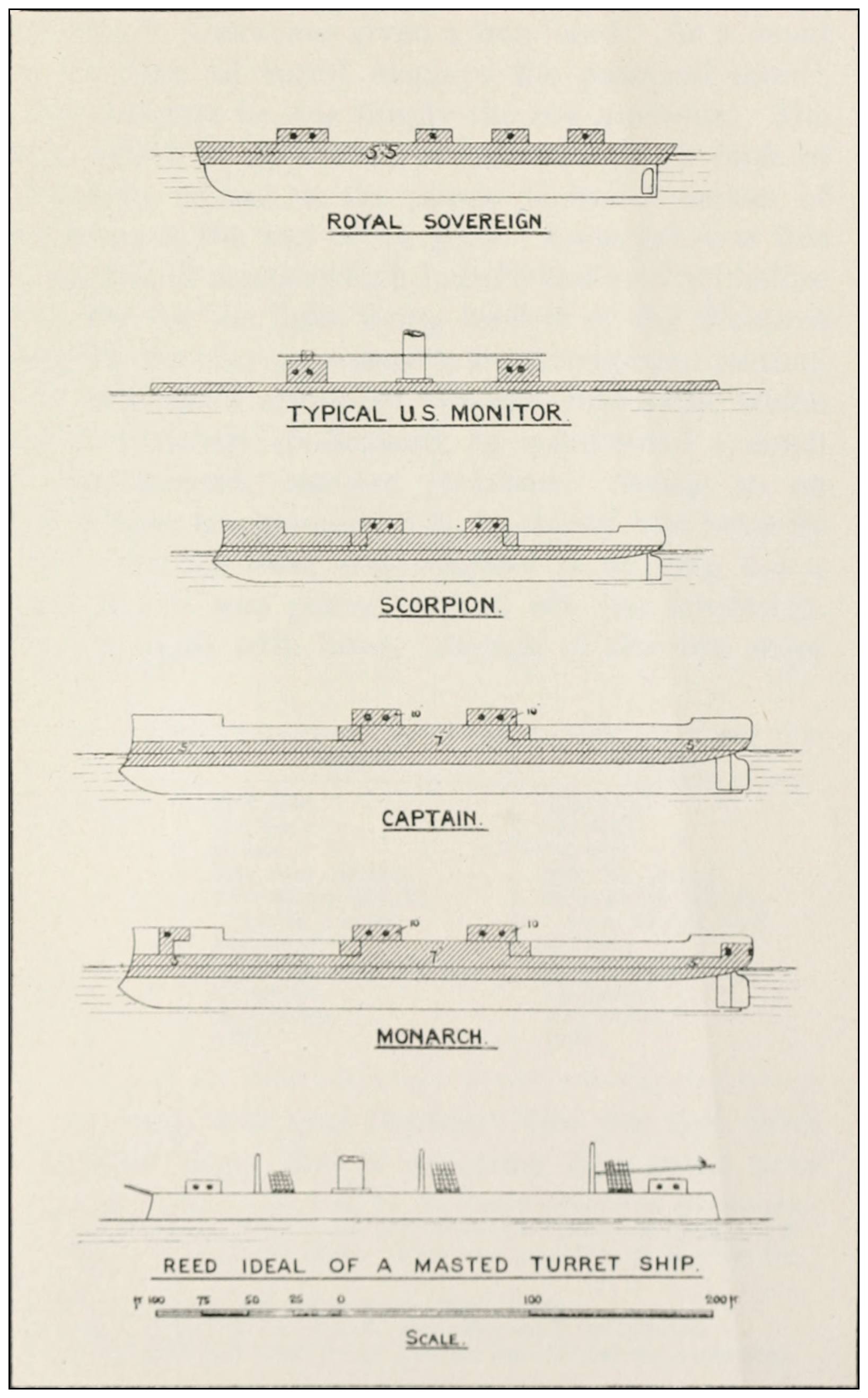 98 The Scorpion and Wivern, built for the Confederate States and bought in 1865. The Peruvian Huascar also ante-dated the Captain in design. All of these were low freeboard ships. Coles had something to do with the designs of all.