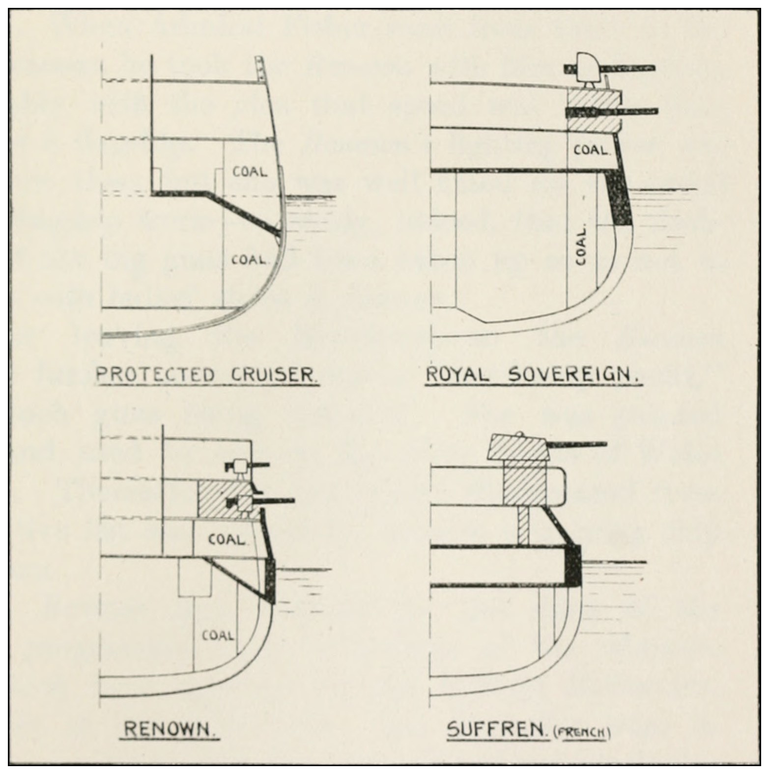 Amongst the Committee’s suggestions had been the abolition of the complete belt, and its concentration amidships. This recommendation was mainly intended to refer to cruising ships rather than to ships definitely intended for the line of battle; but the idea soon spread.