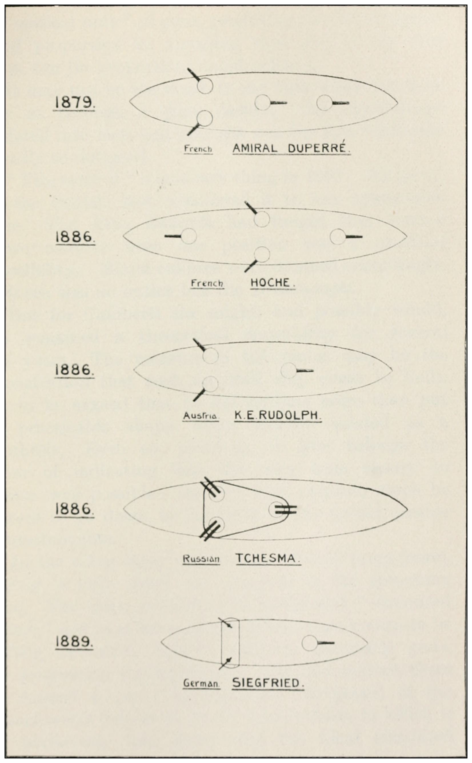 34 In the Chinese ships Ting Yuen and Chen Yuen, built in Germany in 1882 with big guns en échelon, the former had the port big guns foremost, the latter the starboard ones—presumably an appreciation of and an attempt to overcome the inherent defect of the échelon system—the two ships being intended to fight in company, and so have one of the two always in the best fighting position were the enemy anywhere on the beam or quarter.