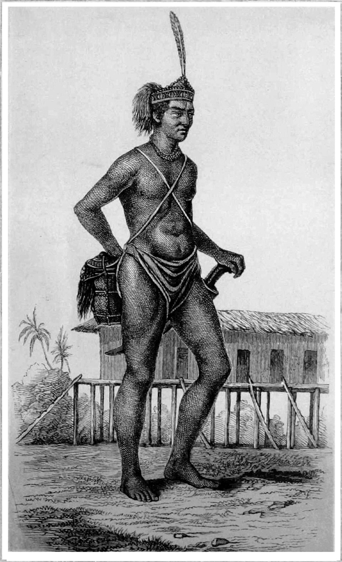 Der Tanz bestand aus drei Abtheilungen. In der ersten ging es ziemlich ruhig her: da ward ganz[S. 217] einfach getanzt; in der zweiten brachten die Tänzerinnen Sträuße von Pfauenfedern, die sie gleich Schwertern wie im Kampfe schwenkten; in der dritten Abtheilung kamen sie mit Bogen und Pfeil bewaffnet und stellten ein ordentliches Gefecht dar, das mit der Niederlage der Hälfte der Kämpfenden endete. Die Getödteten blieben eine Zeit lang auf dem Wahlplatze liegen. Mit ihrer Niederlage zugleich ertönte in der Ferne eine klagende, sanfte Melodie. Die Musik dagegen, die den Tanz begleitete, war sehr lärmend und unharmonisch. Ich fand diese Vorstellung sehr zierlich und ausdrucksvoll und das Auge nicht beleidigend, eine Eigenschaft, die man nicht immer an unsern Balleten rühmen kann. Das Einzige was mir nicht gefiel war, daß die Tänzerinnen die Augen beständig zu Boden geschlagen hatten, eine Sitte, die ich bei den Tänzerinnen der meisten außereuropäischen Völker bemerkt habe, und welche Hochachtung für die Zuseher auszudrücken scheint.