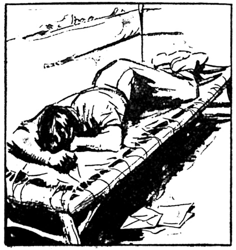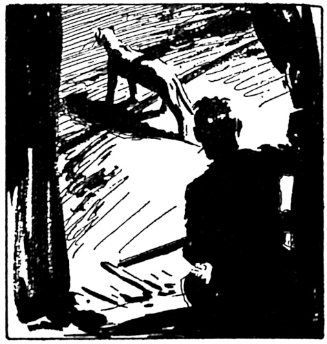 D'Arnot threw himself face downward on the cot.... An hour later he started up, listening. Someone at the door... trying to enter.... Dusk was falling. His hair rose on his scalp.... He reached for the loaded rifle.... Gently the door opened.... Something stood just without.... And then d'Arnot pulled the trigger.