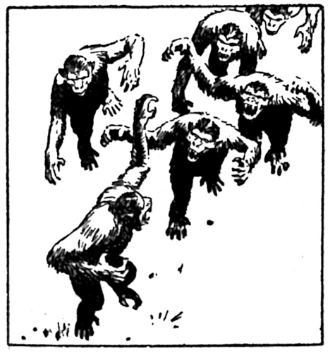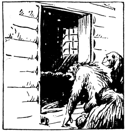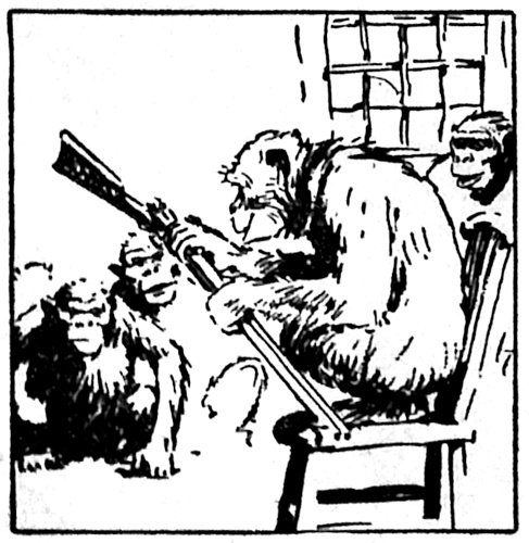 The other apes sat huddled together watching their chief. Suddenly Kerchak's finger closed upon the trigger. There was a deafening roar! The apes fell over one another in their wild anxiety to escape. Kerchak, equally frightened, but still clutching the rifle, sprang through the door, which shut tightly after him.