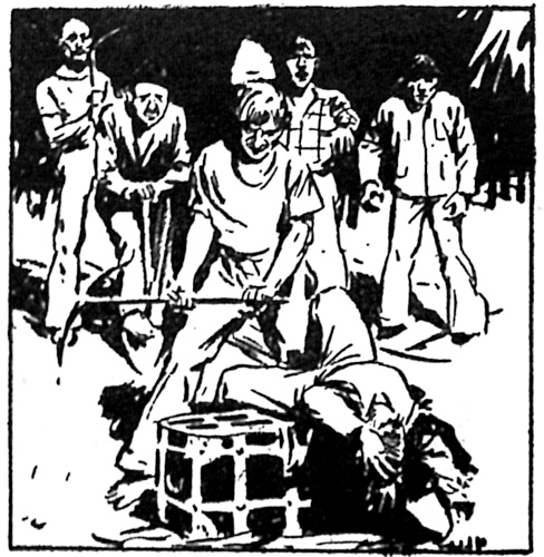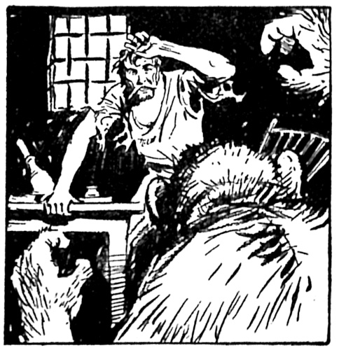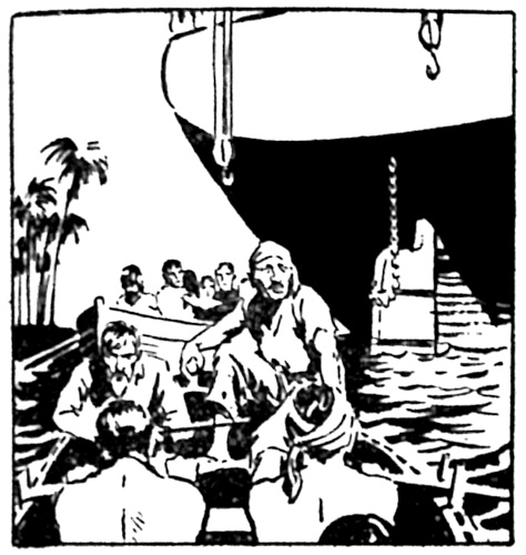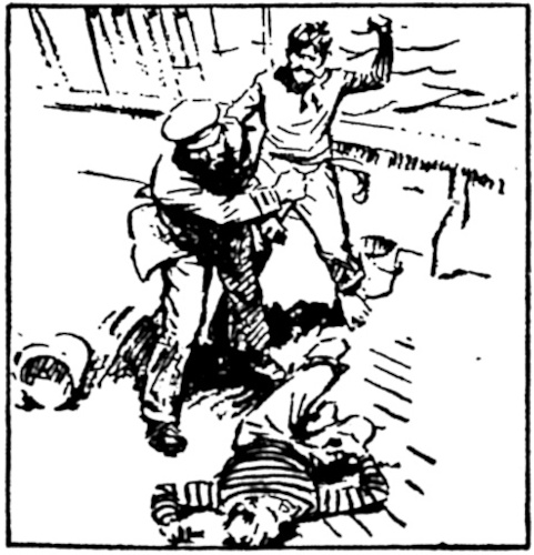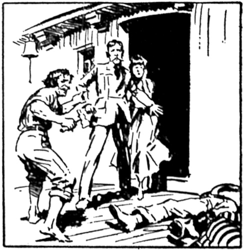 Beyond sight of land, the Fuwalda's captain, with a terrific blow, felled an old sailor who had accidentally tripped him. The swarthy bully's brutality caused big Black Michael to crush the captain to his knees. This was mutiny. The enraged captain suddenly whipped a revolver from his pocket and fired.