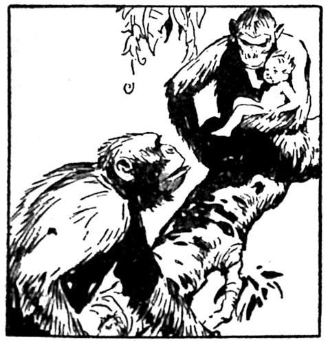 Far off the tribe heard the fierce challenge of the gorilla. It was soon discovered that Tarzan was missing. Kerchak, the king-ape, was strongly opposed to sending assistance. He had no liking for the strange little waif. But Kala was of a different mind. She fairly flew through the matted branches!