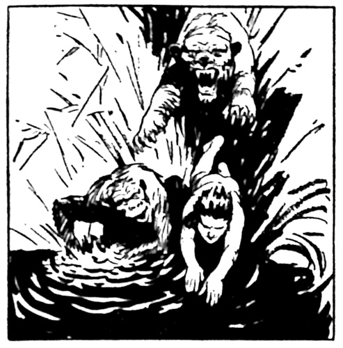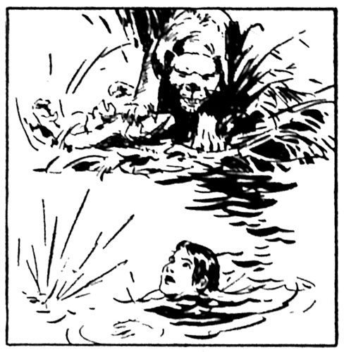 The little ape crouched tremblingly. Not so Tarzan, the man-child. Before him lay the deep waters of the little lake—behind him certain death! Tarzan had always hated water. He could not swim. But before the great beast had covered half her leap, Tarzan felt the chill waters close above him.