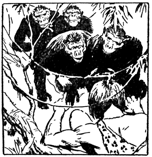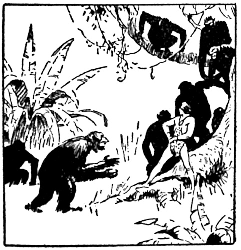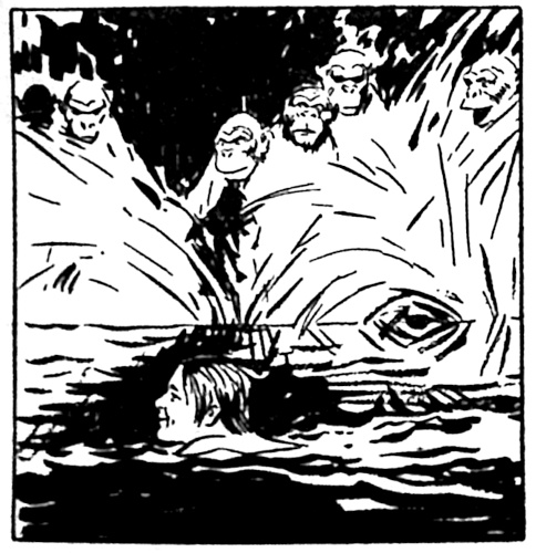 Rapidly he moved his hands and feet. Soon his nose was above water. Sabor was intently watching. Tarzan raised his voice in the tribal call of distress. Presently fifty great apes swung rapidly toward the scene. Then Sabor disappeared quickly into the brush and Tarzan was assisted to dry land by some of his ape friends.