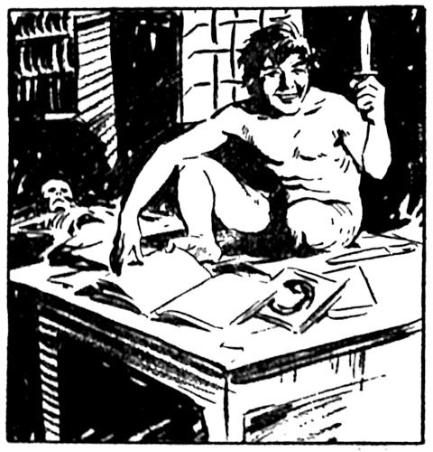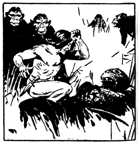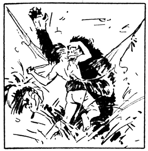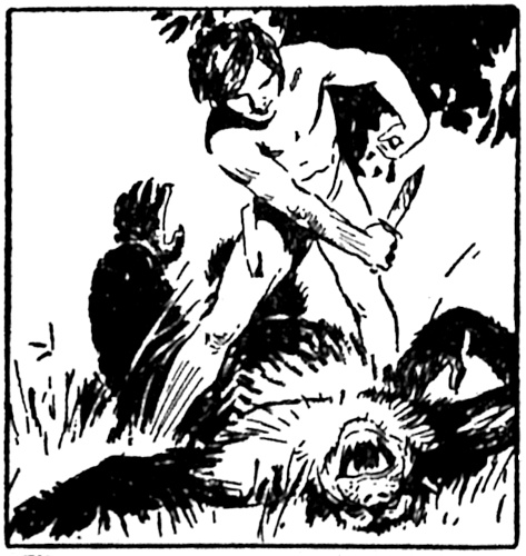 Tarzan in one hand still clutched the knife he had found in his father's cabin. Accidentally he turned its point toward the hairy breast. As it sank into its body the gorilla shrieked in pain and rage. Then Tarzan plunged the blade repeatedly and to the hilt into Bolgani's breast.