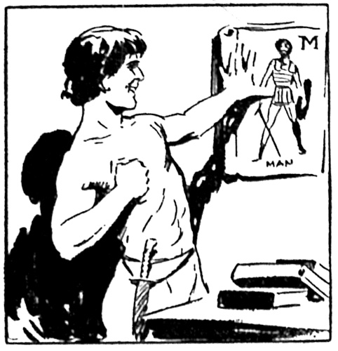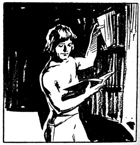Tarzan slowly and cautiously entered. He saw three skeletons, giving but passing heed. The other contents riveted his attention! He opened chests, examining minutely strange tools, weapons, books, and clothing. Finding a sharp hunting-knife, he immediately cut his finger. A child's illustrated alphabet interested him greatly. Dusk was approaching.
