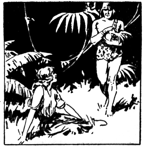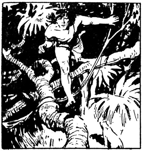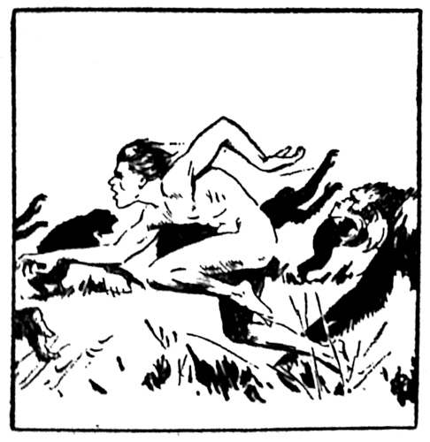 Again, Tarzan accepted a challenge. He was to kill a lion single-handed. Naked he went into the jungle armed only with knife and rope. With his wild-days methods, at last he got the beast. Shouting the awesome victory cry, he shouldered the carcass, returned to the amazed group, and claimed the reward.