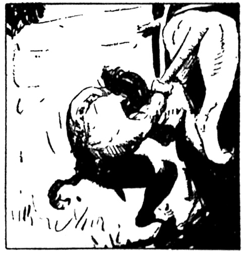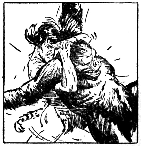 On the hotel veranda the black spied Tarzan. With a roar he charged the ape-man. Tarzan met the rush; his steel muscles gripped the black wrist of the uplifted knife hand, a single wrench left the hand dangling below a broken bone. Crying with agony, the fellow ran away. Tarzan resumed reading.