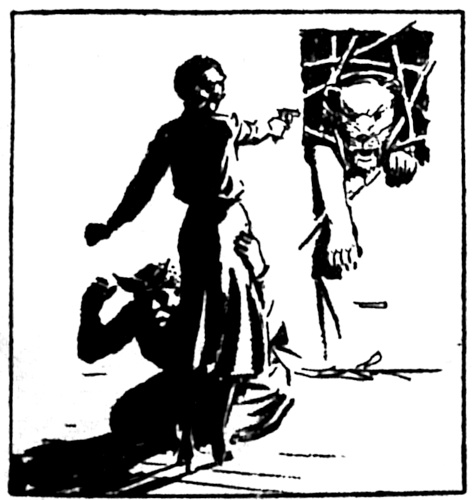 "What was it?" she whispered. "I do not know," he answered, gravely. "It is too dark to see so far, perhaps only a shadow cast by the rising moon." "No, John, if it was not a man, it was some huge and grotesque mockery of man. Oh, I am afraid." He could feel her heart beat as she clung to him, trembling and terrified.