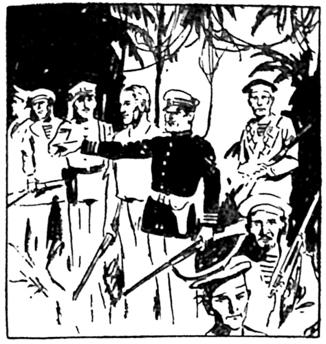 Alarmed, the sailors came running to the scene. A volley of arrows fell among them. They answered with their rifles, shooting toward their concealed enemies. After a terrific hand-to-hand fight, leaving many dead on both sides, the natives fled, taking Lieutenant d'Arnot with them to their village.