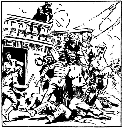 Enraged, the blood-thirsty ruffians charged the officers representing the hated authority of the ship. Most of them were armed with boathooks, axes, and crowbars. The officers retreated before the infuriated rush of their men. An axe cleft the captain from forehead to chin.