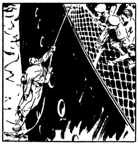 The handsome "Monsieur Tarzan" was a great favorite during the voyage. One morning as he watched the dancing spray, he heard a cry "Man overboard," and saw a youth slip to the dark waters below. Quick as a flash, Tarzan dived after, clasping him almost before the waters closed over them.