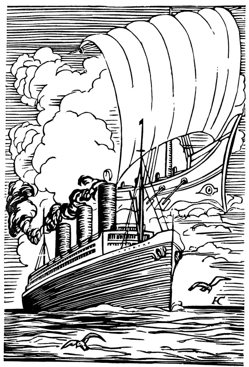 But what a poster an artist can make of her! No artist, however gifted, could do that with a publisher’s contract or a mortgage. So a ship, after all, whatever nautical and engineering science may do with her, aided by the tastes and habits of millionaires, and the rules and regulations of many committees of exacting experts, must be a symbol which still suggests to men in bondage an undiscovered [Pg 35]golden shore, or fleece, of which they will continue to dream, as they dream irrationally of peace while never ceasing to fashion war.