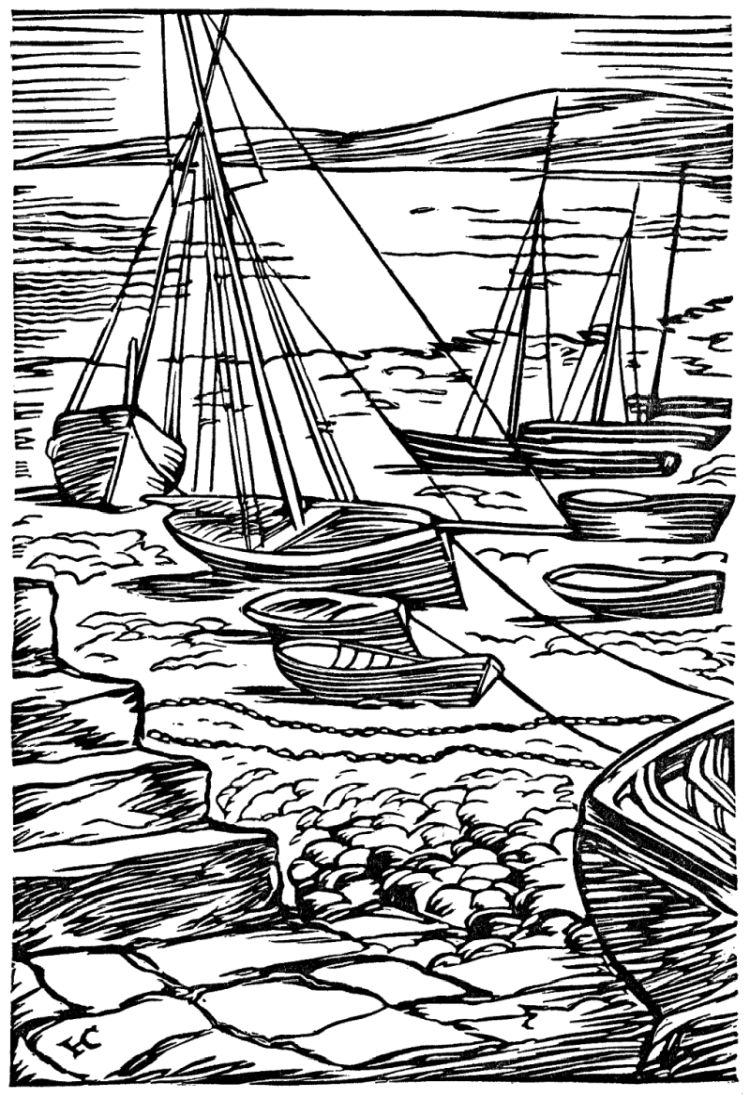 Our line was fast to a ring-bolt which possibly was in the old stonework of that quay wall when the ships which moored there were those that made of a voyage to America a new and grand adventure. That ring-bolt was rust, chiefly. Its colour was deep and rich. With the sun on it, the iron circle on its stem might have been a strange crimson sea-flower pendent from the rock over the tide. A precipitous flight of unequal steps ran from the top of the quay down its face to the water. The steps continued under the water, but I don’t know how far. They dissolved. Of the submerged steps I could not count below the sixth, and even the fourth and fifth were dim in a submarine twilight. The tread of the midway step, which was near my face and just below it, was uncertain whether it ought to be above water or sunk. Sometimes, when I looked that way, it was under a few inches of glass, but as I looked the glass would become fluid and pour noiselessly from it. Once when the glass [Pg 214]covered it I noticed an olive-green crab was on the step, set there, as it were in crystal. When he darted sideways it seemed unnatural, and as if he were alive and free. It was when he moved that I began to suspect that many affairs, an incessant but silent business of life, were going on around me and under the boat.