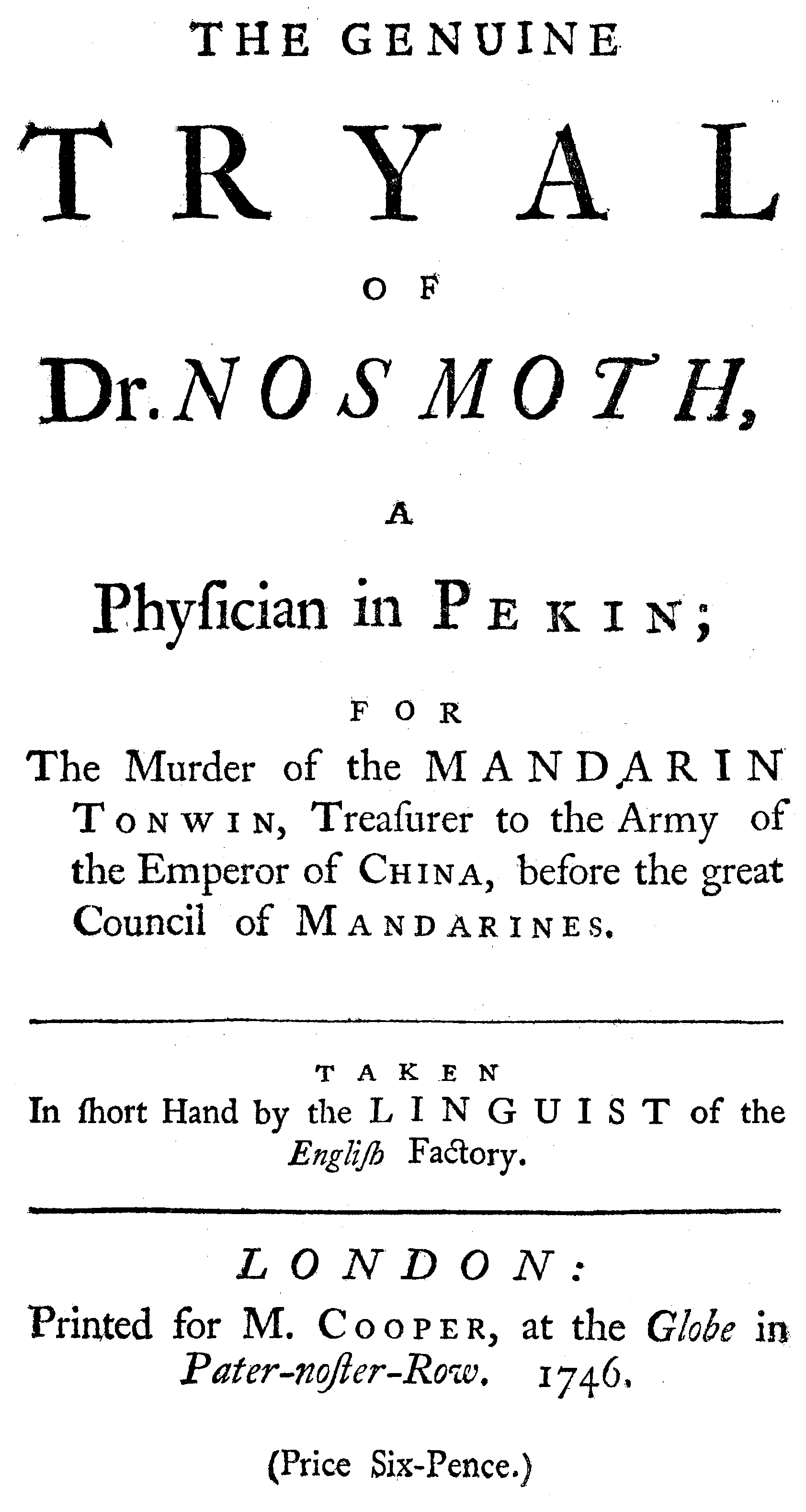 You Nosmoth, Doctor of the Divine Science of Physick, stand indicted before this Sovereign Court, at the Suit of our 15Sovereign Lord the most High, mighty, and Puisant Emperor, Abdaer Emperor to the World, Lord of Vast Territories, Commander of Kings, and Beloved of the Sun, to whom all are Slaves &c. &c. For, that you not having the fear of the Mighty Gods before your Eyes, but being Instigated thereto, by the Suggestion of the Black Angel, who Commandeth the Burning Lake; and with malice in your Heart, and out of Envy and premedicated spite, to the Great Mandarin Tonwin Slave of our Great Emperor, and Treasurer of his Invincible Armies, Didst on the Sixth Day, of the Second Month, of the Year of our Empire, six thousand seven hundred and forty six, conspire and contrive the Death of the said Mandarin; that is on one or other of the Days of the said second Month; thou didst maliciously, with a certain Instrument made of Steel, called a Lancet, stab the said Mandarin in the right and left Arm, and didst take from him, a large Quantity of his Blood, to the amount of fifty seven Ounces; and likewise didst prevail with the said Mandarin, 16by false unreasonable, and scandalous Suggestions, to swallow certain Quantities unknown, of poisonous Drugs, for sixteen or seventeen Days together; and likewise caused during the said Space of Time, to be introduced into the Anus, (Anglice A——se,) of the said Mandarin, a certain Machine, call’d a Clister-Pipe, through which was squeezed a certain further Quantity of poisonous Drugs, into his Bowels; and contrary to the Duty of your Profession as a Physician, ordered the said Mandarin, then your Patient, to eat of Meats and Drinks, improper for his Condition, and neglected to administer such Medicines, as you knew by the Help of the great God Paphor,[A] would have restored him to Health; by all which your Acts of Malice, before-mentioned, you permitted the Angel of Death, to carry away the said Mandarin; by which Means our great Emperor, has lost a faithful Slave, the Empire an useful Member, and the distressed a great Protector; this 17is your Accusation, are you Guilty or not Guilty.