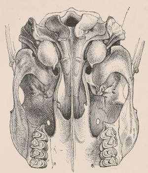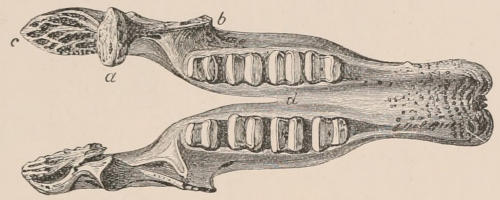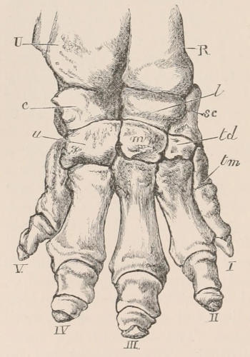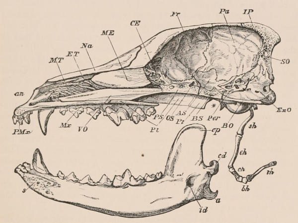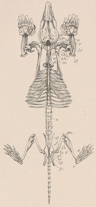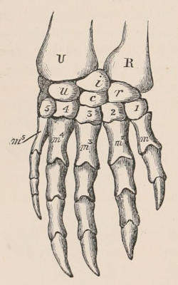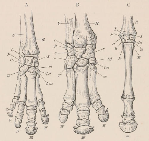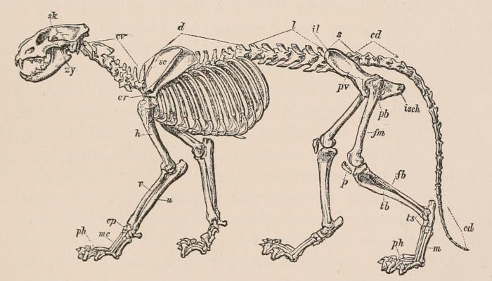 | Definition, 33; Axial skeleton, 34; Skull, 34; Vertebral column, 39; Cervical vertebræ, 41; Dorsal vertebræ, 42; Lumbar vertebræ, 42; Sacral vertebræ, 43; Caudal vertebræ, 43; Sternum, 44; Ribs, 44; Appendicular skeleton, 46; Anterior limb, 46; Shoulder-girdle, 46; Brachium and Antebrachium, 47; Manus, 48; Carpus, 48; Metacarpus and Phalanges, 49; Posterior limb, 50; Pelvic girdle, 50; Thigh and Leg, 51; Pes, 52. | ||