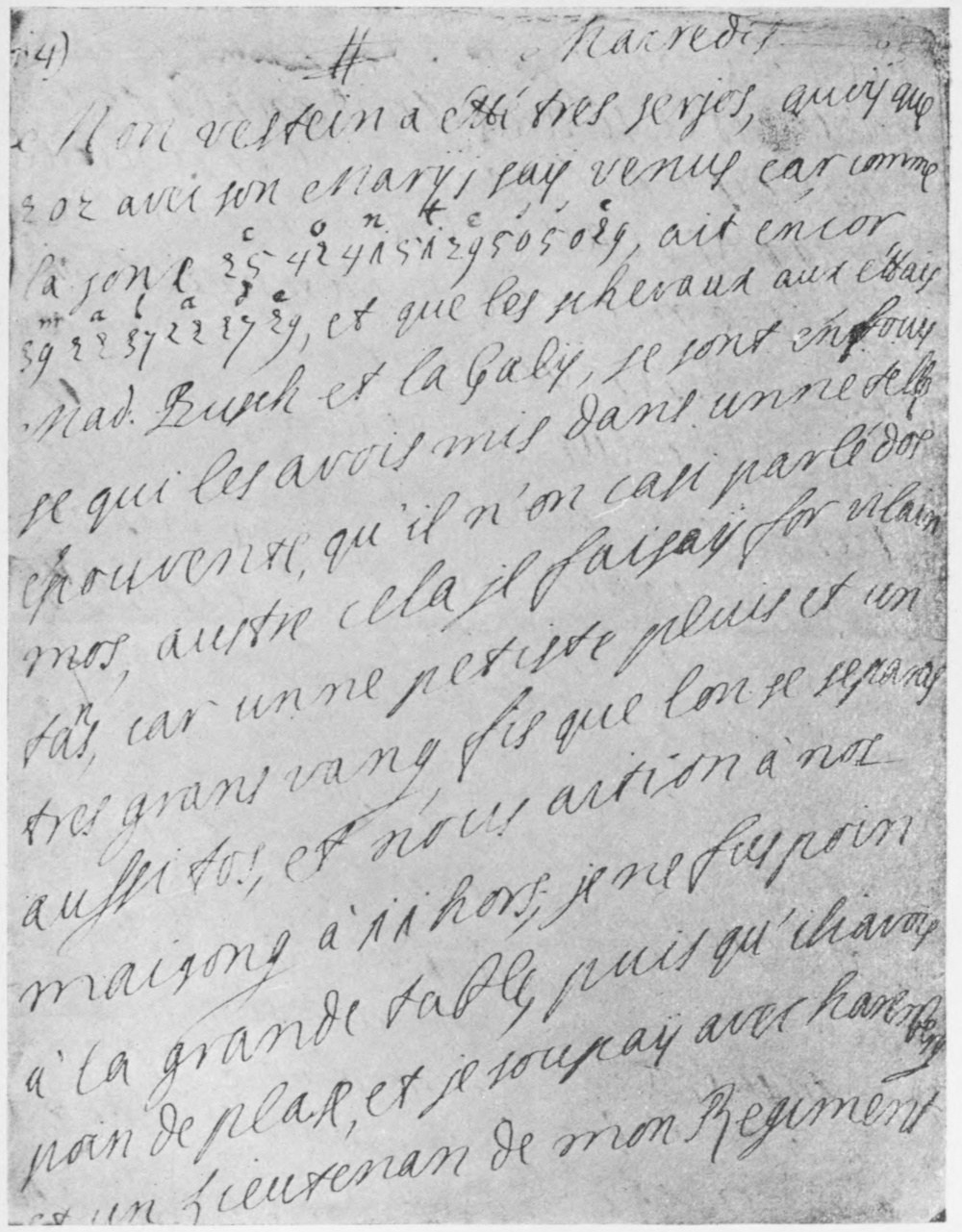 The correspondence between Sophie Dorothea and Königsmarck is very voluminous. The greater part of it (six hundred and seventy-nine sheets, one hundred and ninety-nine from the Princess and four hundred and eighty from Königsmarck) is preserved in the university library of Lund. The letters at Berlin number sixty-five sheets, fifteen from the Princess and fifty from Königsmarck. It is certain that the letters at Berlin and those at Lund spring from the same source, the exact similarity of the writing, the use of the same cypher and the same nicknames, the identity of sentiment and style, and the fact that some of the Berlin letters seem to be answers to some of those at Lund and vice versa, prove this beyond doubt. Clearly they stand or fall together. Applying to the Berlin letters the same tests as applied to those at Lund, they yield absolutely the same results.