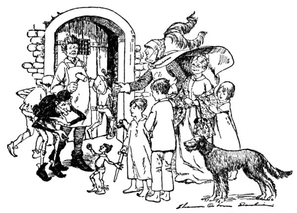 But Peter did not hear him. He was too busily engaged otherwise. The cave dragon had stopped and off jumped Grandma, still in her armor, and off jumped Johnathan and Janet Jane and Nap and Jerry, and off jumped Crubby from his perch behind the dragon’s ear. All of them tried to embrace Peter at once and such a bumping of armor you never heard, and since Peter wore nothing but Riggy’s torn doublet and hose, he was severely pinched by the steel arms that gripped him.