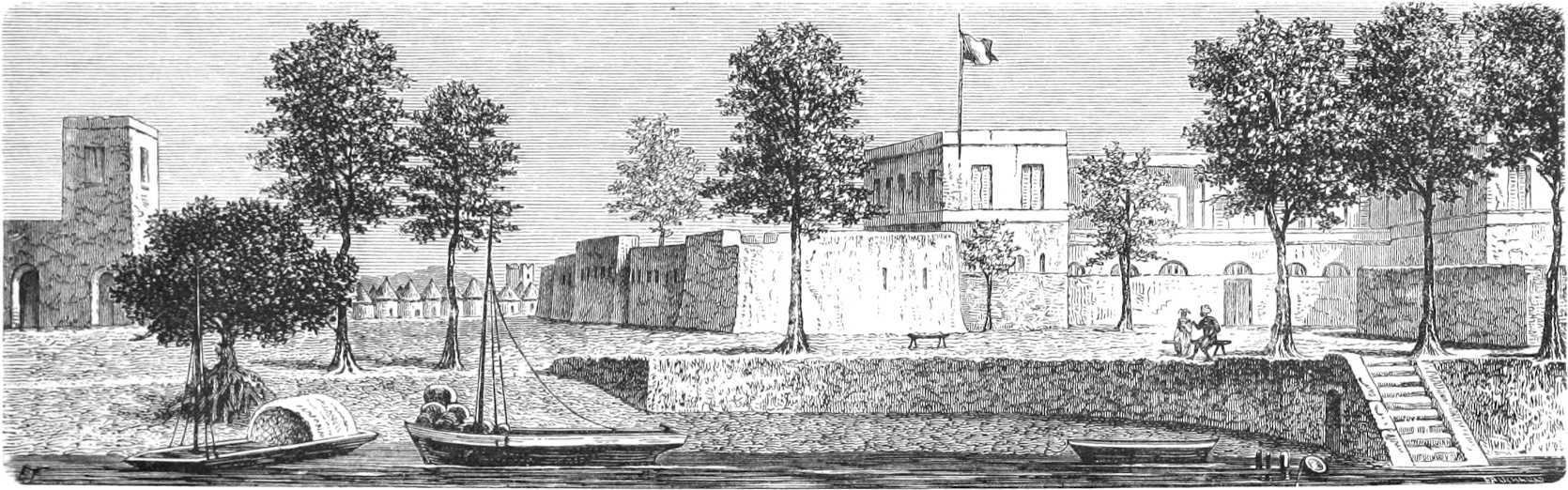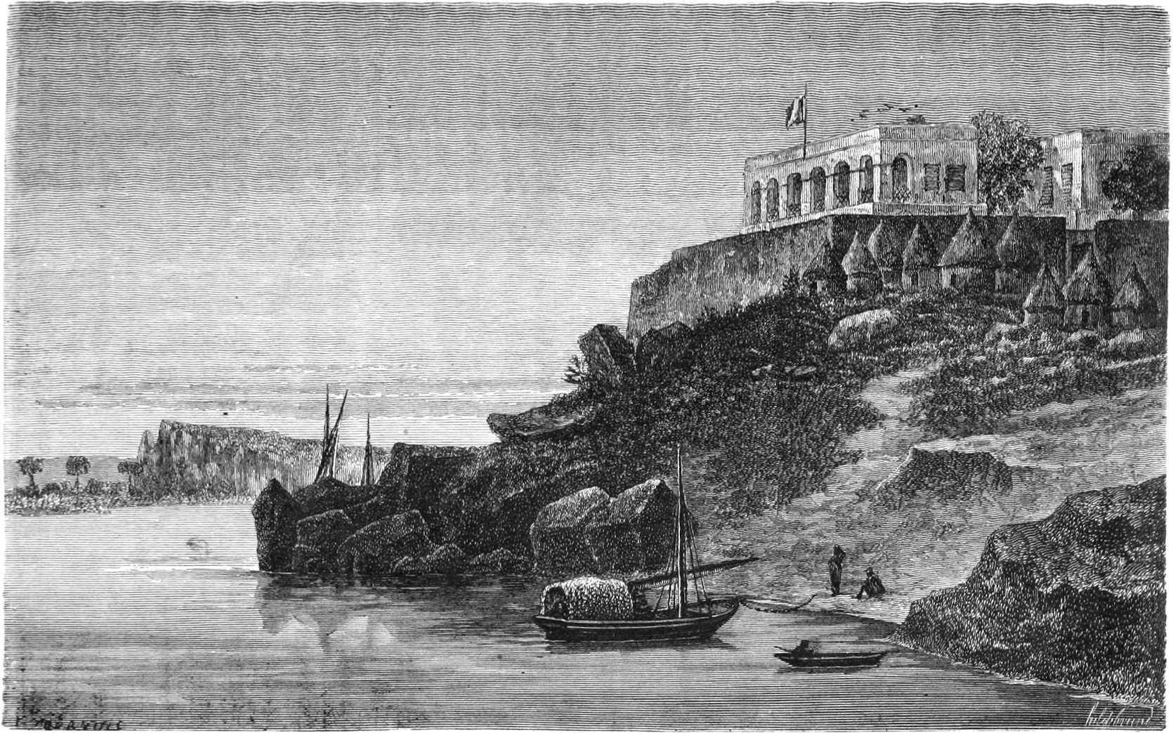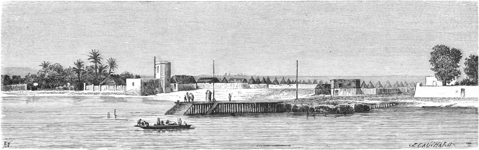 Le 10 juillet nous étions à Gorée, le 12 à Saint-Louis, et je fus tout de suite détaché à terre pour faire les études nécessaires à l’entreprise d’un tel voyage. J’avais déjà servi cinq ans au Sénégal et deux ans dans la station navale du littoral. Il était peu de points de la côte que je ne connusse. Un séjour de neuf mois au milieu des noirs du Haut-Fleuve à Makhana[3], et un pénible voyage d’exploration à l’oasis de Tagant, chez les maures Douaïch, m’avaient préparé. Je connaissais le caractère des noirs et des Maures, la manière de se conduire avec eux ; mais bien que possédant suffisamment l’histoire des voyages en Afrique, il me fallait relire Raffenel, Caillé, Mongo Park et même Barth, quoiqu’il ne parle pas des mêmes régions.