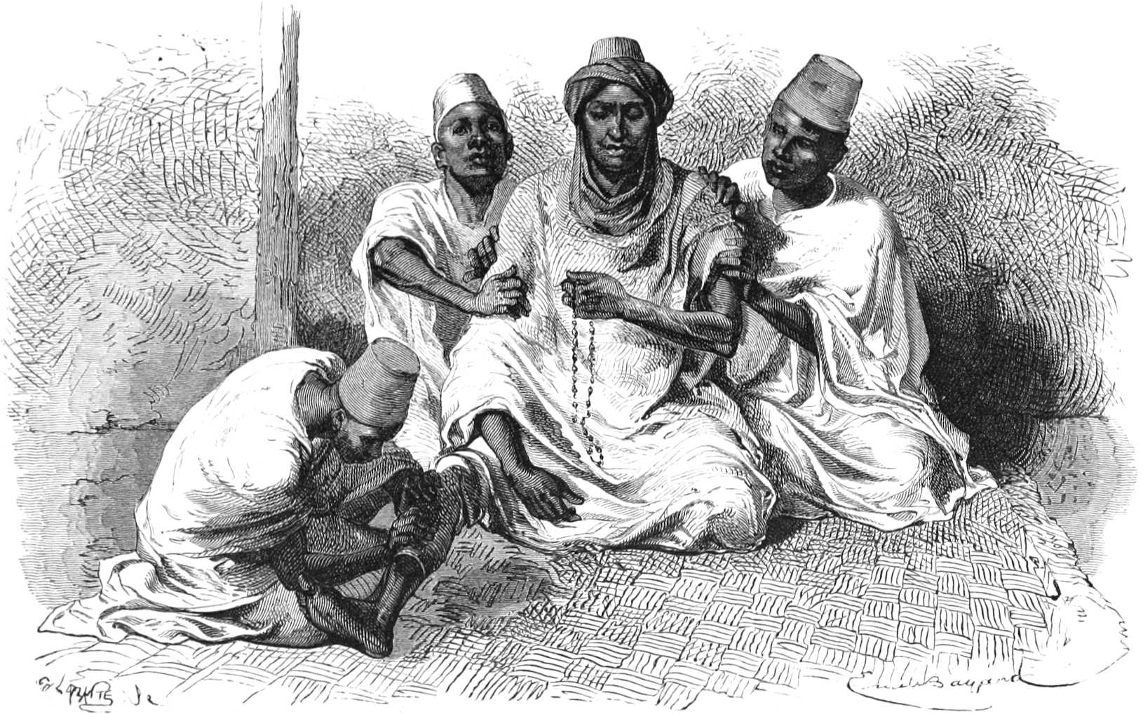 « Il y a trois ans environ arriva à Saint-Louis un parent du cheick de Tombouctou, nommé Amadi ben Baba Ahmed, marabout vénéré dans le Sahara, comme tous les membres de cette illustre famille, dont les simples élèves jouissent même, au loin, d’une considération et d’un respect remarquables ; le gouverneur du Sénégal le reçut avec bienveillance et lui fit visiter ce qu’il pouvait y avoir de curieux à Saint-Louis pour lui. Ainsi Amadi assista à un bal à l’hôtel du gouvernement, et rien ne peut exprimer[8] son étonnement au milieu des lumières et des brillantes toilettes que les glaces reflétaient à l’infini autour de lui. Ce n’était plus la stupéfaction d’un sauvage incapable d’apprécier ce qu’il voyait, mais plutôt l’extase d’un homme instruit, intelligent, ayant beaucoup lu, mais n’ayant vu, en fait d’intérieur de palais, que les sombres maisons en boue, sans fenêtres, des Ksours du Sahara. Il dut faire, à son retour dans son pays, des récits très-curieux et très-enthousiastes de ce qu’il avait vu.