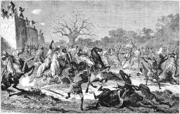 « Les Touaregs et les Maures, qui n’attendaient que ce moment, tombent dessus, les battent avec d’autant plus de facilité, que les gens du Macina font défection, et en font un grand massacre. Quelques débris seulement de l’armée et El Hadj Omar en personne, parviennent à se sauver en traversant le Niger sur des barques et se retirent à Hamdou Allahi. Ceci se passait il y a sept ou huit mois. Dans cette bataille, les Touaregs n’étaient armés que d’armes blanches, lances, sabres et javelots, car les Touaregs de cette contrée méprisent souverainement les armes à feu ; les Pouls et les Maures, au contraire, étaient armés, suivant leur habitude, de fusils, la plupart à deux coups.
