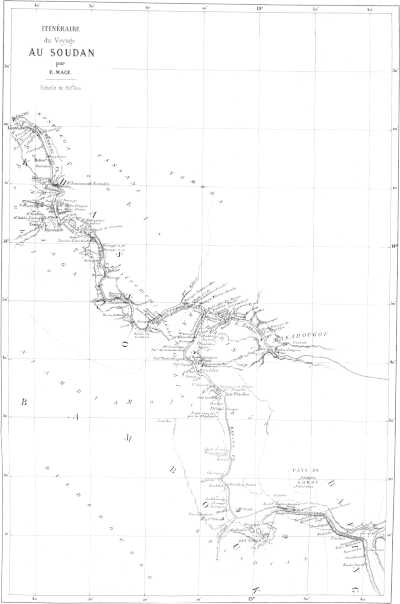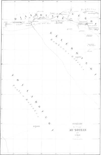 En réponse à mon projet, je reçus, après quelque temps, l’avis officieux que M. le colonel Faidherbe, que l’on rappelait au gouvernement du Sénégal avec le grade de général, désirait faire explorer par terre la ligne qui joint nos établissements du Haut-Fleuve au haut Niger, et qu’il avait parlé de moi comme lui paraissant très-capable de remplir cette mission.