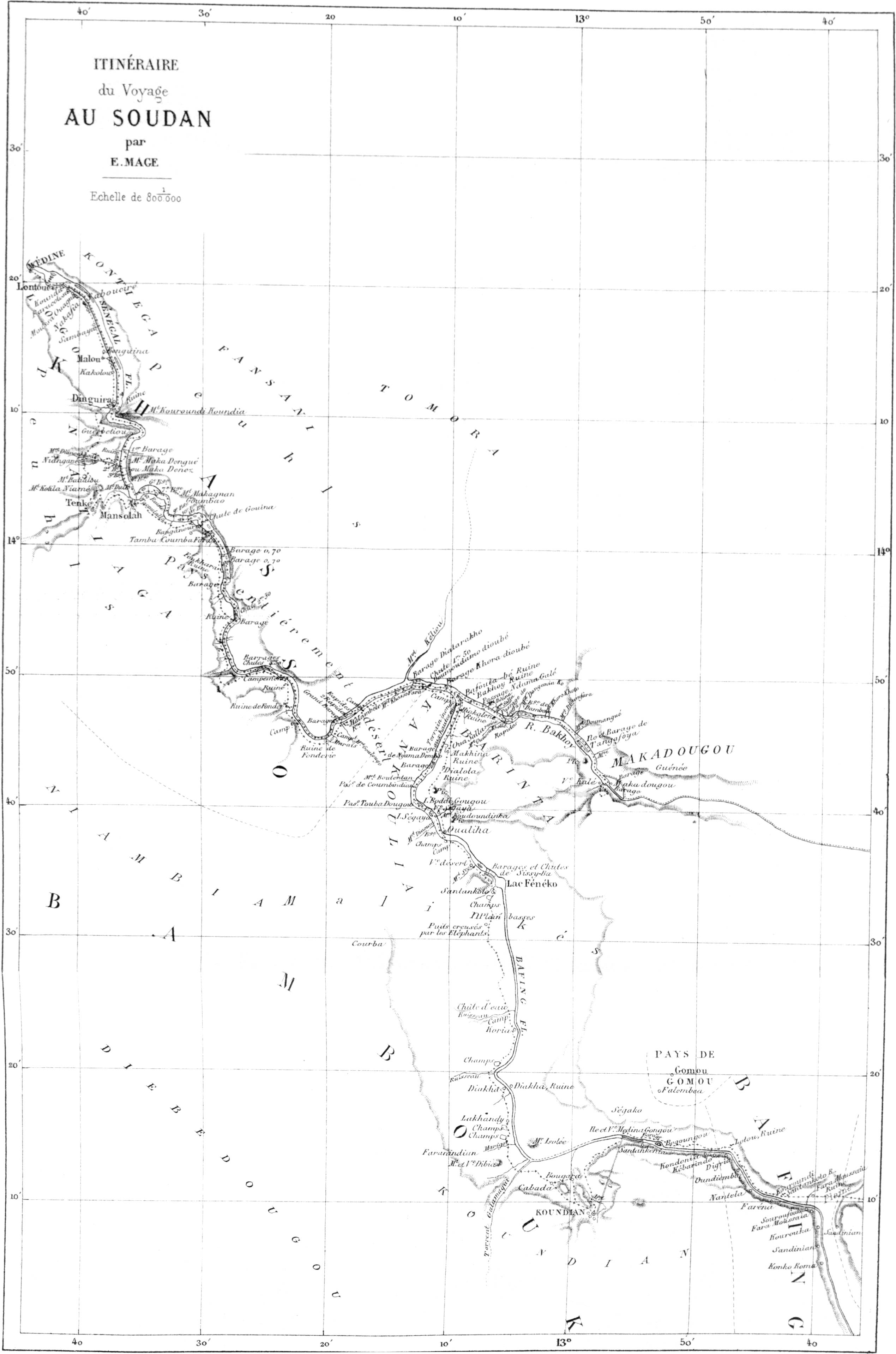 | Chapitre XXXIX. — Départ de Ouosébougou. — Siradian. — Hofara. — Elingara. — Boulal. — Sékhello. — Je suis pris pour un Maure. — Bagoyna. — Marques de l’épizootie. — Route pour Touroungoumbé. — J’arrive épuisé. — Bon accueil. — Pillage de Maures. — En route sur Nioro. — Entrée triomphale. — Mustapha. — Son accueil. — La ville. — Séjour. — Tentative pour me retenir. — Position délicate de Mahmadou Abi. — Le schérif de Fez. — Visite aux frères d’El Hadj. — Je pars. — Cadeaux à Mustaf. — Échange de bons procédés avec Mahmadou Abi. — Départ de Nioro. — Médina. — Les trois Gadiaba. — Youri. — Petite pluie. — Je pars sans mes guides. — Birou. — Aspect des terrains. — Ali, notre guide, ambassadeur d’Ahmadou. — Ouagadou. — La vallée du Guidi-Oumé. — Khoré. — Le Kirigou. — Khassa. — Togno. — Fanga. — Niogoméra. — Tanganaya. — Takhaba. — Niakhatéla. — Makhana. — Route en forêt. — Tornade. — Inondation. — Passage d’un torrent. — Mounia. — Route sur Kouniakary. — Séjour dans ce village. — Tierno Moussa. — San Mody. — Situation politique du pays. — Dernière route. — Arrivée à Médine. — De Médine à Saint-Louis et en France | 633 |