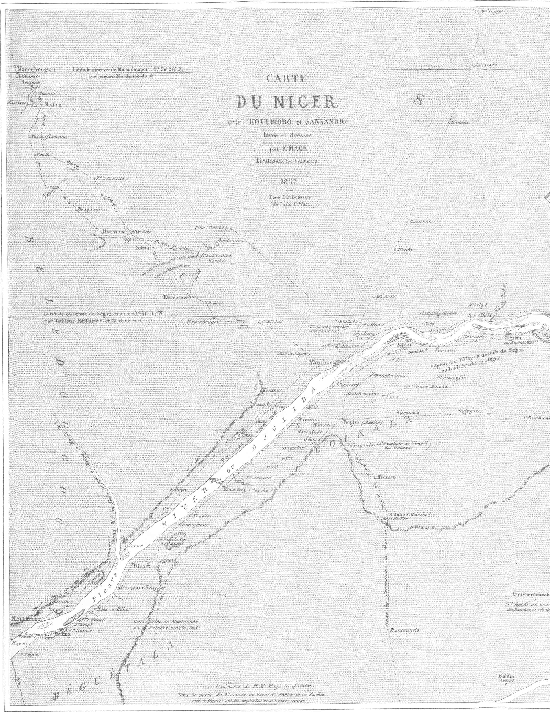 Tels étaient les premiers mots d’un projet d’exploration du Niger que je soumettais au ministre de la marine et des colonies au mois de février 1863. Je voyais là une grande et belle mission, un avenir sérieux, de véritables services à rendre à mon pays, et ces considérations me décidaient à braver les périls qui s’attachent toujours à ces sortes de missions, à imposer à ma famille et à moi-même les tourments d’une longue absence, les inquiétudes d’un silence forcé, et à ma jeune femme la dure épreuve d’une première séparation qui pouvait être éternelle.