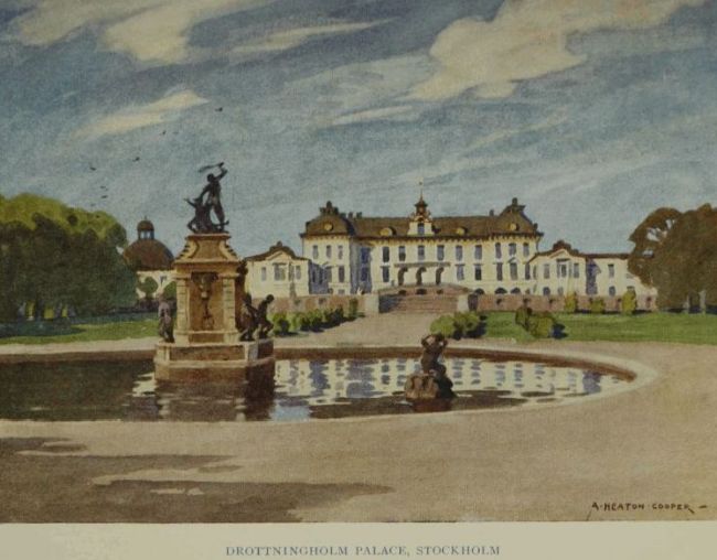 Geologically, too, Sweden is one of the oldest parts of the world, its formation differing materially from that found in other European countries. It is, generally speaking, a very rich land, but its wealth usually entails a considerable amount of work to become productive, as the greater part of it consists of granite, timber, lime, and iron-stone. Everywhere, except perhaps in the south of Skåne, you will come across towns that are built on granite or even iron-stone rock, there being such a profusion of the latter that there are actually some localities like Kiruna where the iron mines serving as foundation do not consist of underground veins, but of mountains of ore from which the iron has to be blasted from the surface almost in its natural state. The spring water issuing from these rocks is strongly tonifying, moreover, and at such places as Porla has been converted to practical uses, its healing and curative qualities in all cases of debility or anæmia being remarkable. Next to iron, Sweden’s greatest asset lies in her timber[8] land, and dense forests abound which cover an area greater than the British Isles. It is estimated that over 52 per cent of the soil is covered by trees the greater part of which consist of pine, fir, and birch, while immense quantities of timber are cut every year for the wood pulp and other industries. Much more than the above might here usefully be written concerning Sweden’s great industrial resources, but as the writer of the present volume is not concerned with writing a book on Swedish industries but is merely seeking to offer some illustration and account of the many beauties and points of interest, artistic, historic, and social, of this little-known country, we will readily leave off considering such matters to find ourselves upon more congenial and, we will venture to say, more artistic ground.