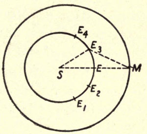 Systematic observation among the Greeks began with the rise of the Alexandrian school. Aristillus and Timocharis set up instruments and fixed the positions of the zodiacal stars, near to which all the planets in their orbits pass, thus facilitating the determination of planetary motions. Aristarchus (320-250 B.C.) showed that the sun must be at least nineteen times as far off as the moon, which is far short of the mark. He also found the sun’s diameter, correctly, to be half a degree. Eratosthenes (276-196 B.C.) measured the inclination to the equator of the sun’s apparent path in the heavens—i.e., he measured the obliquity of the ecliptic, making it 23° 51’, confirming our knowledge of its continuous diminution during historical times. He measured an arc of meridian, from Alexandria to Syene (Assuan), and found the difference of latitude by the length of a shadow at noon, summer solstice. He deduced the diameter of the earth, 250,000 stadia. Unfortunately, we do not know the length of the stadium he used.