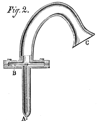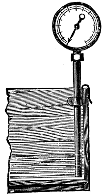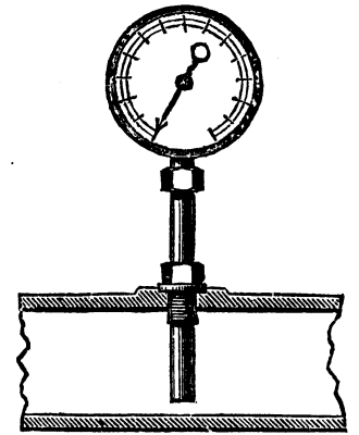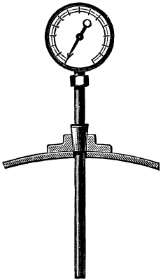 This instrument is composed of a metallic vessel or tube which contains the liquid to be exposed to heat, and of a spring manometric apparatus communicating with the tube, and by means of which the existing temperature is shown. The dial may be provided with index needles to show minimum and maximum temperatures, as well as be connected with electric bells (Fig. 1) giving one or more signals at maximum and minimum temperatures. The vessel to contain the liquid may be of any form whatever, but it is usually made in the shape of a straight or a bent tube. The nature of the metal of which the latter is made is subordinate, not only to the maximum temperature to which the apparatus are to be exposed, but also to the nature of the liquid employed. It is of either yellow metal or iron. To prevent oxidation of the tube, when iron is employed, it is inclosed within another iron tube and the space between the two is filled in with lead. When the apparatus is exposed to a high temperature the lead melts and prevents the air from reaching the inner tube, so that no oxidation can take place.