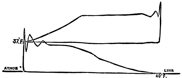In the following experiments the standard temperature of the water was taken as 60° F., and as the coal gave 13.4° of rise of temperature, 67° F. was selected as the standard room temperature. The reason for this room temperature is obvious, for, whatever heating effect the higher temperature of the room may have upon the water in the cylinder during the time occupied by the first half of the experiment, would be compensated for by the loss sustained during the second half of the experiment, when the temperature of the water exceeded that of the room. The mean of numerous trials gave 13.4° F. rise of temperature, equal to 14.74 lb. of water per lb. of coal. When the water was at 50° and the room at 57°, the mean of several experiments gave 13.5° rise of temperature. When the water was 40° at starting and the room at 47°, 13.65° was the average rise of temperature. Trials were made at intermediate temperatures, and the results always showed that higher figures were recorded when the water was coldest. With a view of getting uniformity in the results it was thought well to make experiments, in order to find out what temperature the room should be at, so that this coal might give the same result with the water at 50°, 40°, or at intermediate temperatures. Without going much into detail, it was found that when the temperature of the room was at 40° and that of the water 40°, and the experiment was rapidly and carefully performed, 13.4° rise of temperature was given; but this result could be obtained without special effort when the room was 42° and the water 40° at starting. It is evident that the cooling effect of the air in the room upon the water cylinder is very appreciable when the water has reached 13° above that of the room. When the water was at 50° and the room at 55°, the coal gave 13.4° rise with ease and certainty, and it would not be out of place to remark here that with those coals which burn well in Thompson's calorimeter, the results of several trials are remarkably uniform when properly performed. With the water at 70° and the room at 80°, a like result was worked out. Experiments at intermediate temperatures were also carried out (see table in sequel). It is true that the whole difference of temperature we are dealing with in making these corrections is only 0.25, but 0.2 in the result, when multiplied by 537 to bring it into calories, as is done by the authorities in Italy, makes more than 100 heat units--a serious difference when 5d. per ton fine is attached to every 100 calories lower than the number guaranteed.